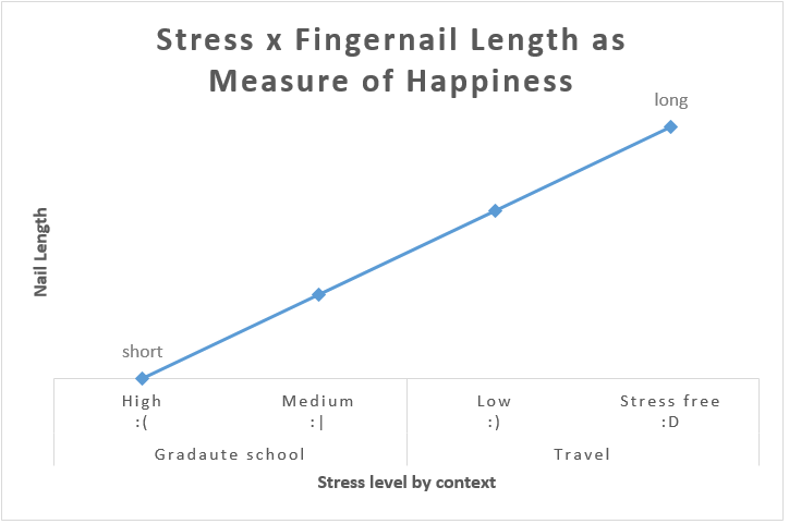 Usually, I am a nail biter, and now I'm realizing nail biting is not just a habit, it's a direct symptom of stress in my life. There’s a correlation between the length of my nails and how content I am. To illustrate, see the helpful graph I have provided below... :)