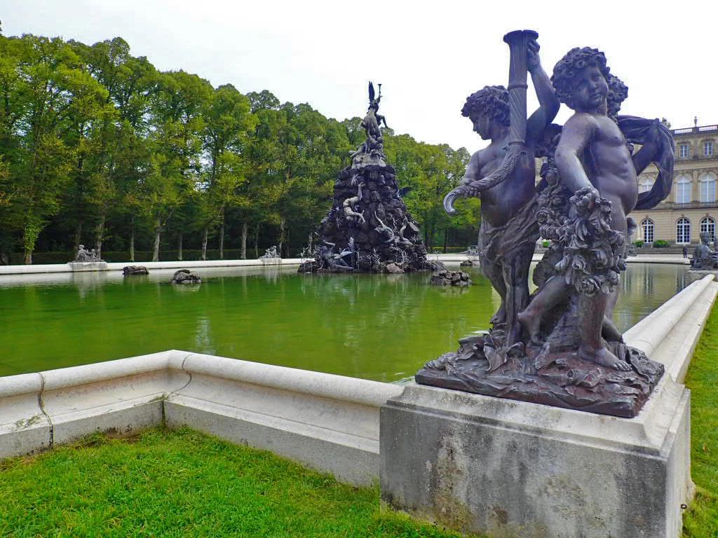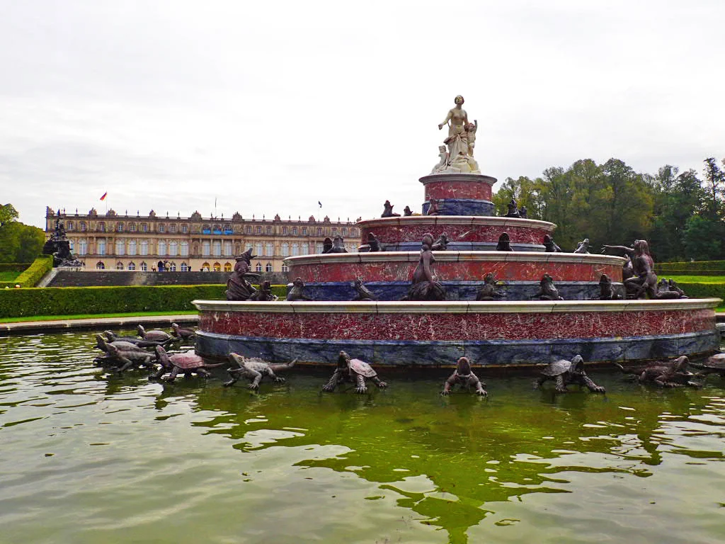 We entered the grounds through what I later learned is the Herrenchiemsee’s backyard gardens. Enormous statues in fountains emerged out of stone pathways winding between beautifully kept gardens. Each fountain was a copy of the fountains at the Palace of Versailles. For example, Latona-Brunnen is a replica of the fountain of the same name at Versailles which tells the legend of goddess Latona: Lycian peasants did not offer Latona and her children, Apollo and Diana, water to drink so she punished them by turning them into frogs.