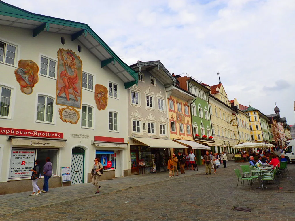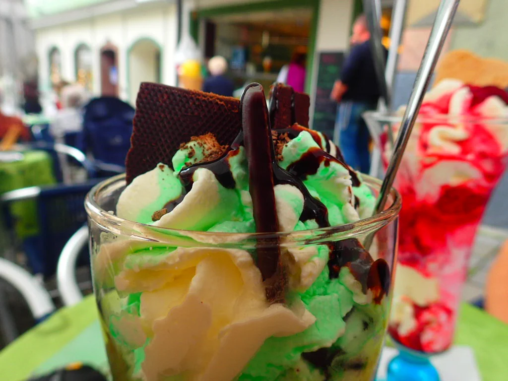 We drove back into Germany through small towns and farmland, stopping for dessert in the town of Bad Tölz. The town is set into a hill with shopping and cafes along one main strip. There were many people out at the cafés even on the weekday we were there. It’s common for Germans to eat a dessert in the afternoon, usually of cake and tea or coffee. We opted for some ice cream at a place with a ridiculously large selection of creative sundaes. I had a hard time deciding but finally went with my favorite—a kind of mint chocolate chip but with fudge and chocolate chunks instead. Nom!
