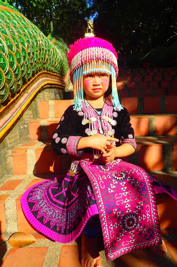 It’s 30 Baht to enter the temple or 50 if you need to take the lift up to it. There are 304 stairs to climb, lined with gorgeous carved dragons, and riddled with hill tribe children playing in their traditional dress. I asked a young girl if I could take her photo. She gladly accepted and posed like she’s been doing it all day.