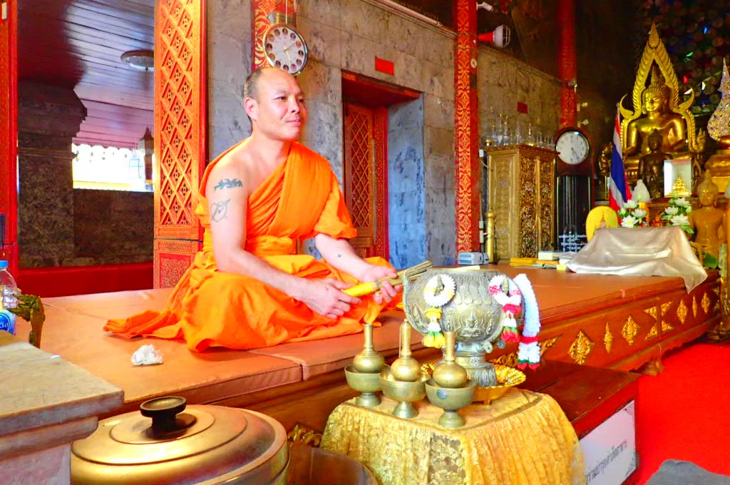I did not participate in any of these traditions but I did write my name on the robe. A couple of times a year, the monks lead a procession and wrap the robe around the Chedi to bring good fortune and success.