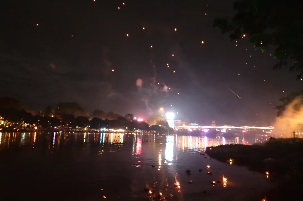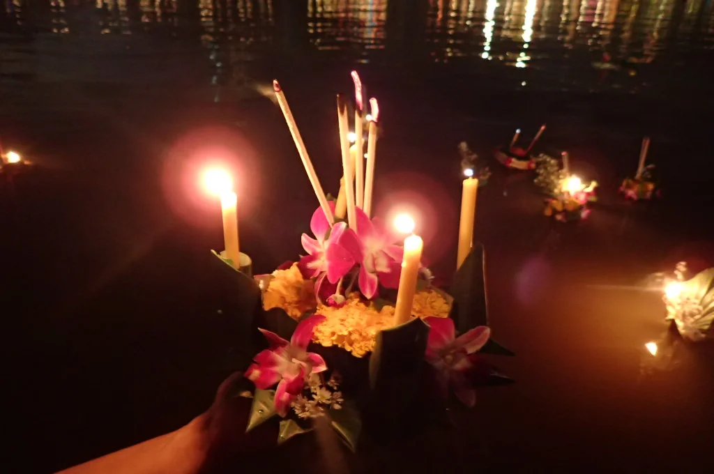 Coinciding with Yi Peng on the November full moon is the Loy Krathong festival involving small, hand-crafted floats with candles sent down the river. The release of lanterns and the floating of the krathong symbolize the bringing of good luck and letting go of past negativity.