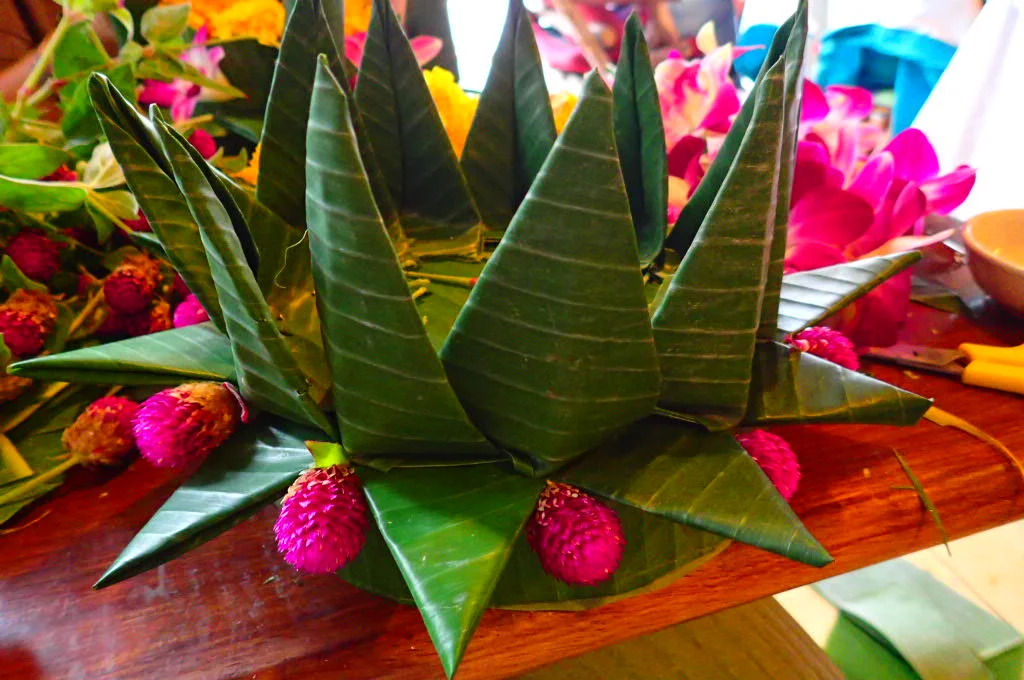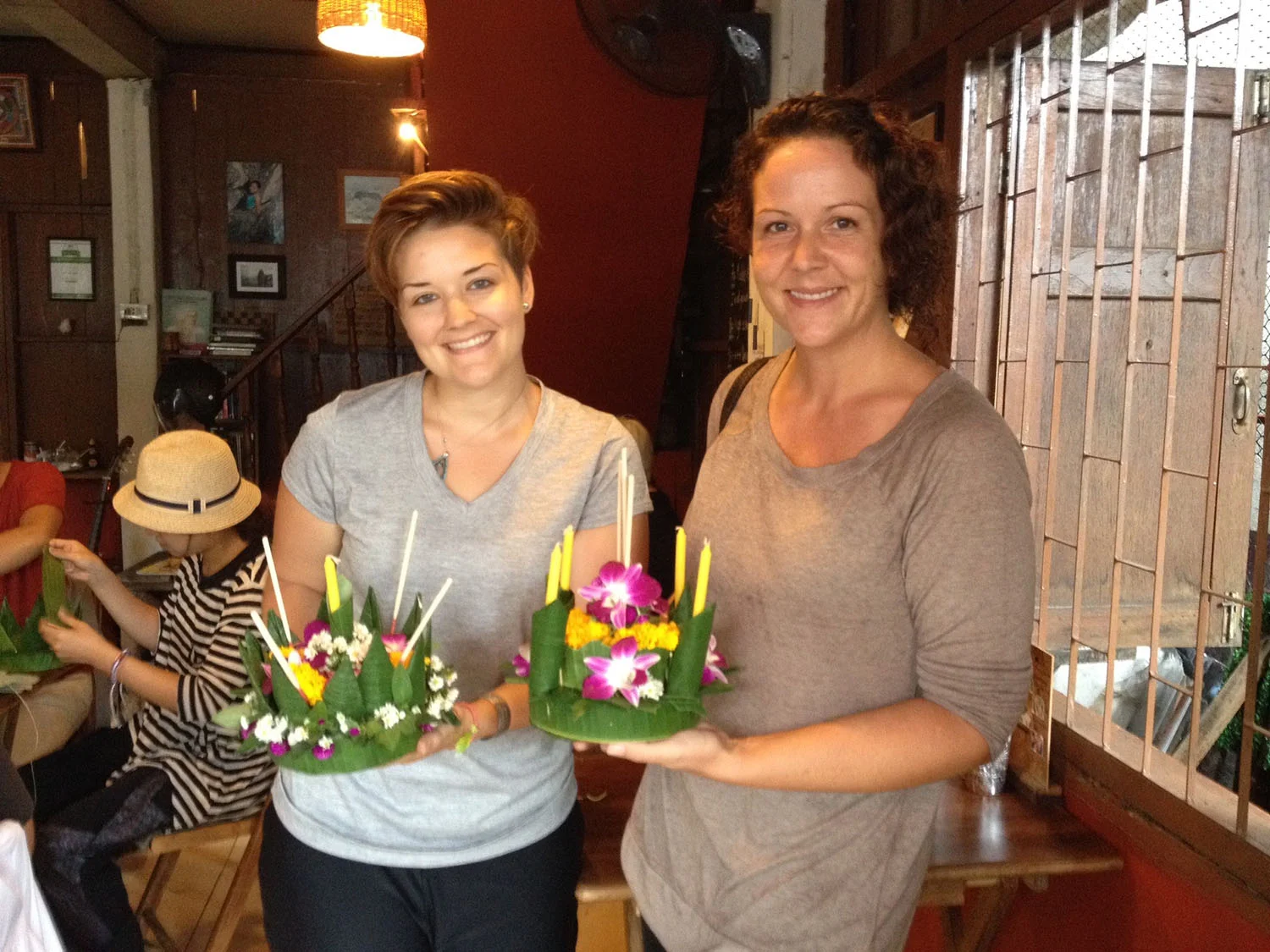I had my lantern tucked under my arm and a krathong float balancing on my hand as we walked along the city streets. Earlier in the day, Meg, a friend of Samart’s from Oklahoma, and I had bought the lanterns for 30 baht each and then randomly joined a gathering of people learning how to make traditional floats. Floats are available for purchase at the festival, usually using Styrofoam as a base. But the traditional way is with a slice of banana tree trunk decorated with intricately folded banana leaves, flowers, incense, and candles. Thai locals thought we had purchased ours like many other tourists since we did such a good job making them!