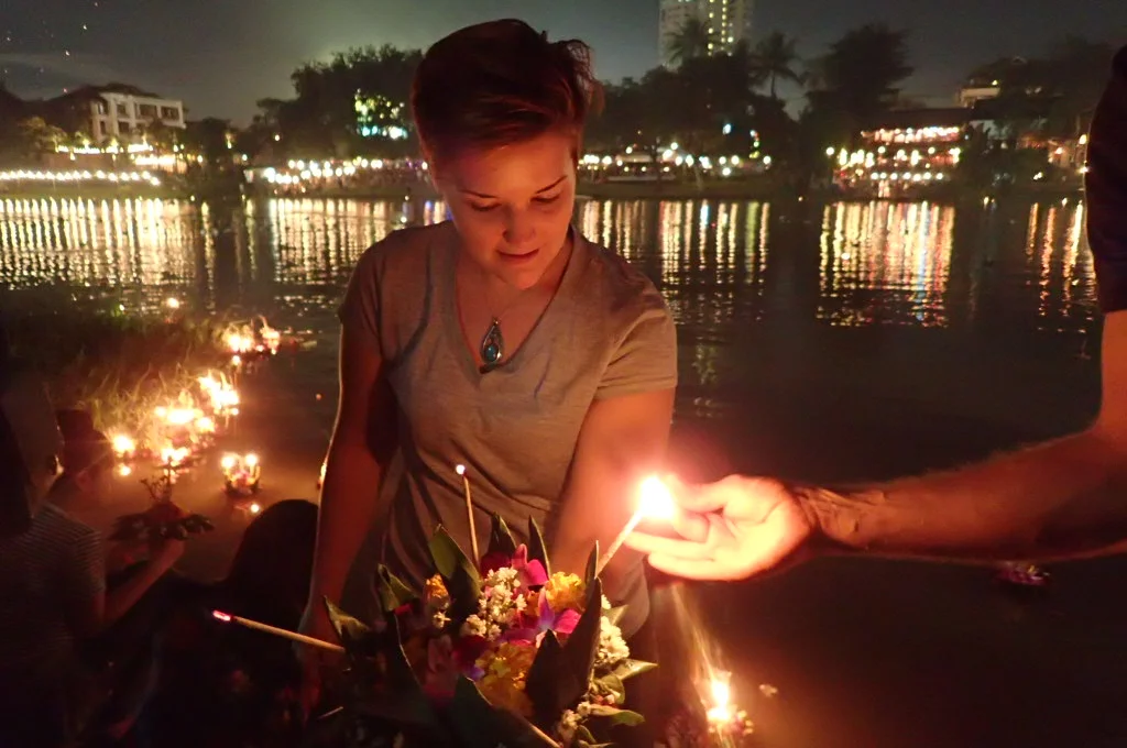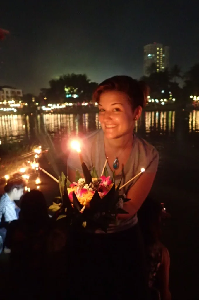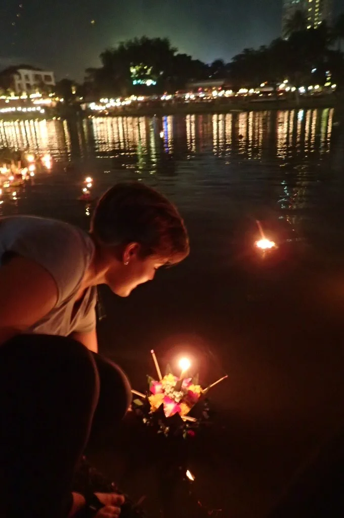 Keeping with tradition, I put a strand of my hair and a fingernail into the float. This symbolizes the release of any negative thoughts or past grudges. I decided I was going to be letting go of the stress and bad taste I had in my mouth from 6 years of grueling PhD work. With the release of the lantern symbolizing a future of good luck and the send-off of my negative thoughts on a float down the river, I was feeling as uplifted and carefree as ever! Fireworks blasted off, lanterns soared up above, and the river was alive with speckles of candlelight. I felt lucky already.