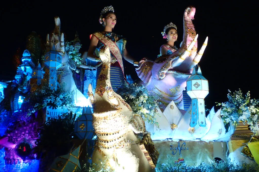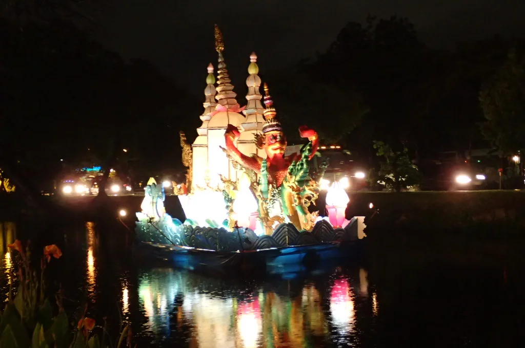 Along the waterway surrounding the old city, tons of people lit candles and big businesses showcased enormous krathong floats.