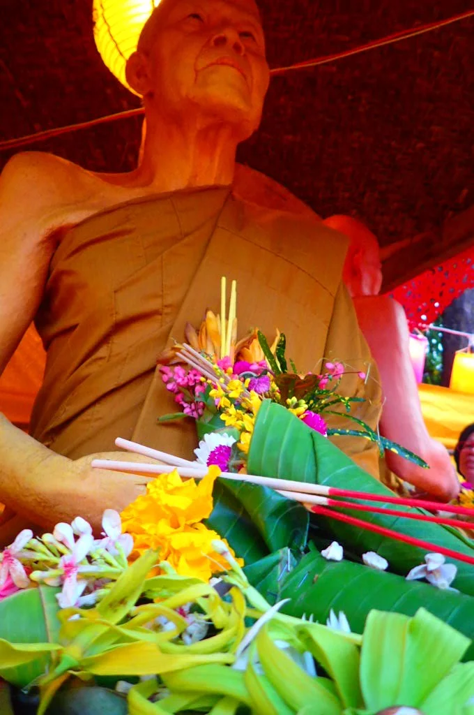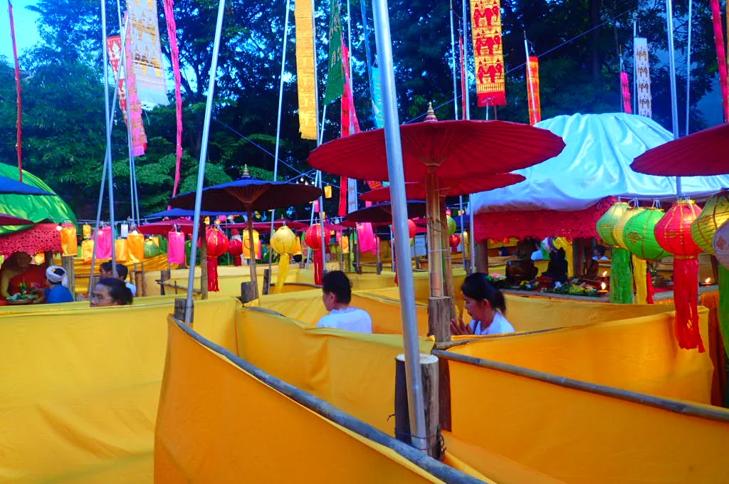 The temples hung traditional lanterns and held small activities for locals. For instance, there was a fun maze I came across on my way back from talking to a monk. Bamboo poles propped up swaths of colored fabric and lanterns creating a small labyrinth leading to a Buddhist shrine at the center and wax figures of famous monks throughout. Thai people were walking through to music, making offerings to Buddha, and generally having a grand old time laughing with each other. Supposedly, this was another Yi Peng tradition; a small ceremony in which people receive good luck for making their way through.