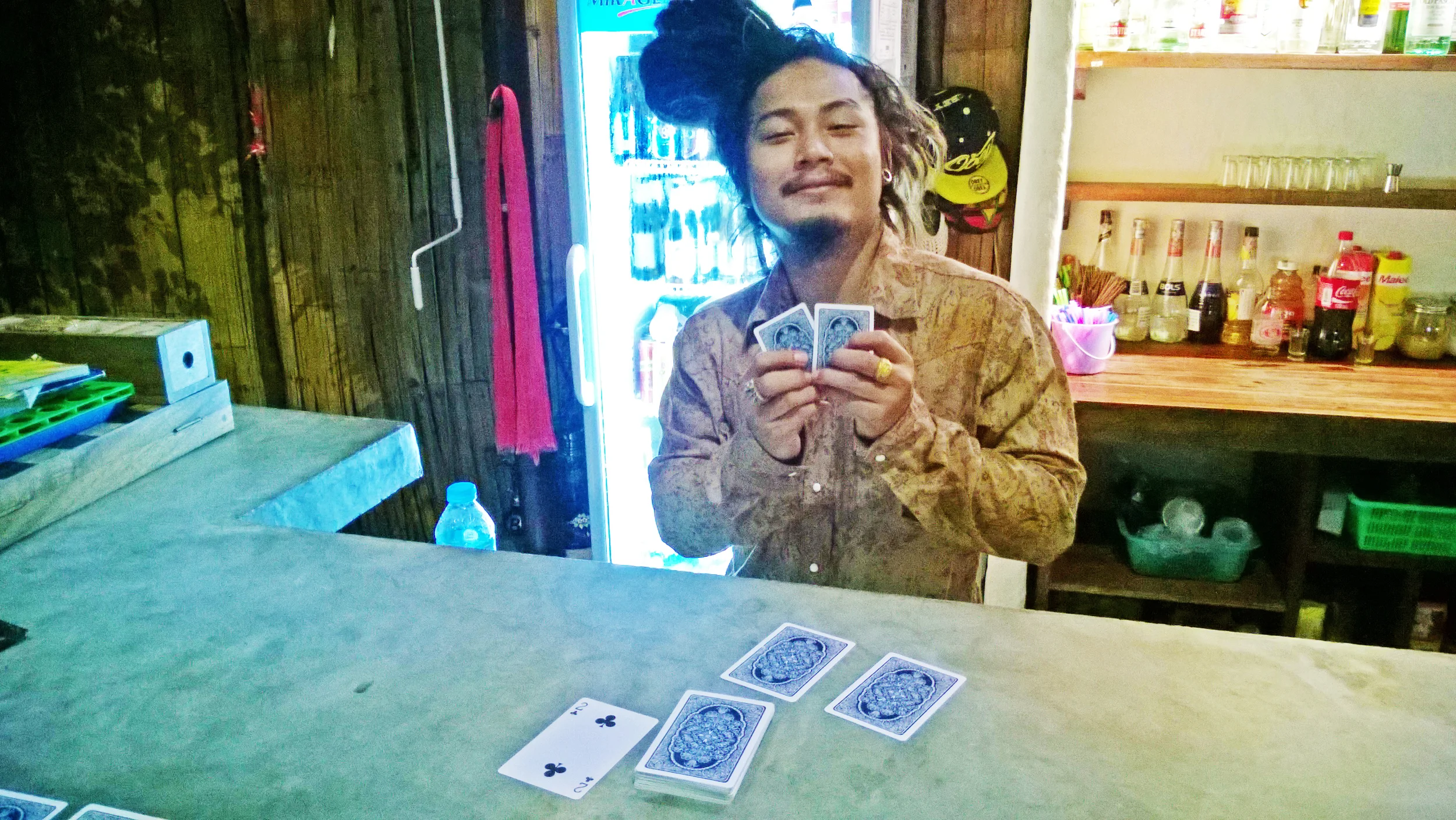 The bartender at the resort, Deisha, became a good friend during my time there. One of many Rastafarian Thai people in Southern Thailand, Deisha is a very outgoing guy, always welcoming tourists and passersby announcing “Happy hour!” One day he took me on his motorbike for lunch to experience an authentic Thai meal. On another occasion, he taught me how to play a card game called Monkey. Felipe and I played a few rounds with him. I don’t usually enjoy playing card games, but I have now played this game 5 other times and taught this game to at least 15 people since I left Ko Tao.