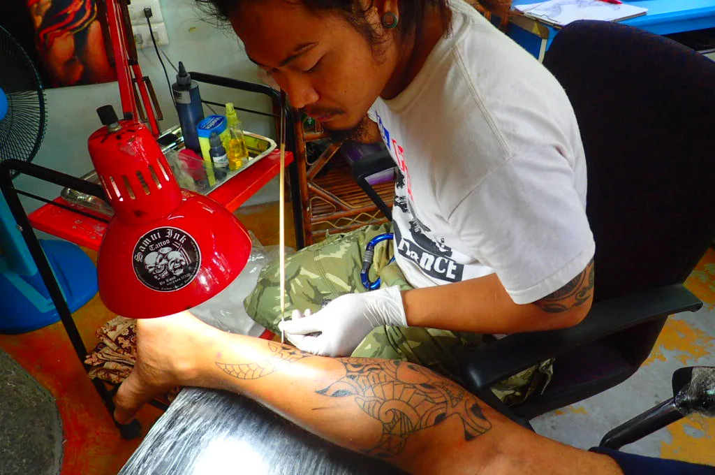 During the daytime when the bar is closed, Deisha runs a bamboo tattoo shop across the street from the resort. Bamboo tattoos or yantra tattoos are done by tapping the ink into the skin using a long, thin, sharpened piece of bamboo with needle(s) at the end rather than a machine. The technique originated in Cambodia and I learned it’s actually healthier for your skin, hurts less, and you can swim and be active with it immediately after the artist finishes. The reason is the skin is punctured rather than torn resulting in less bleeding and faster healing. Felipe decided to treat himself to a birthday bamboo tattoo—a badass hammerhead shark. Deisha did an awesome job!