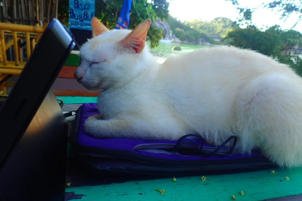 One morning, I woke up before dawn to write on the beach and watch the sunrise over the east side of the bay. A stray cat that frequents the resort joined me. He was content to sit next to me as I wrote. Together, we watched as the bay tilted further downward revealing the sun’s rays. He eventually came up onto the table and chose the thick, plush case of my Surface as a proper bed. I named him Milk Dud. Milk Dud became my buddy during my stay, always coming around to the beach at the resort for a head scratch.