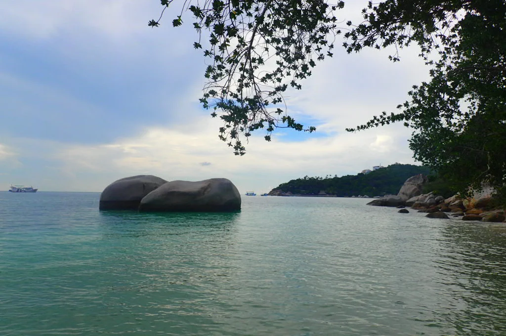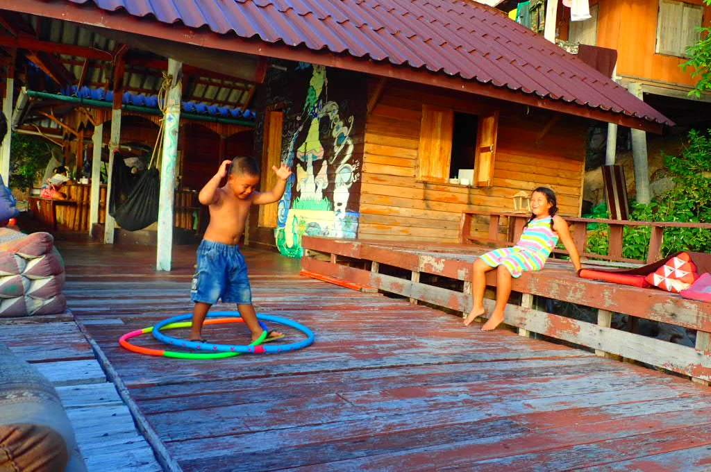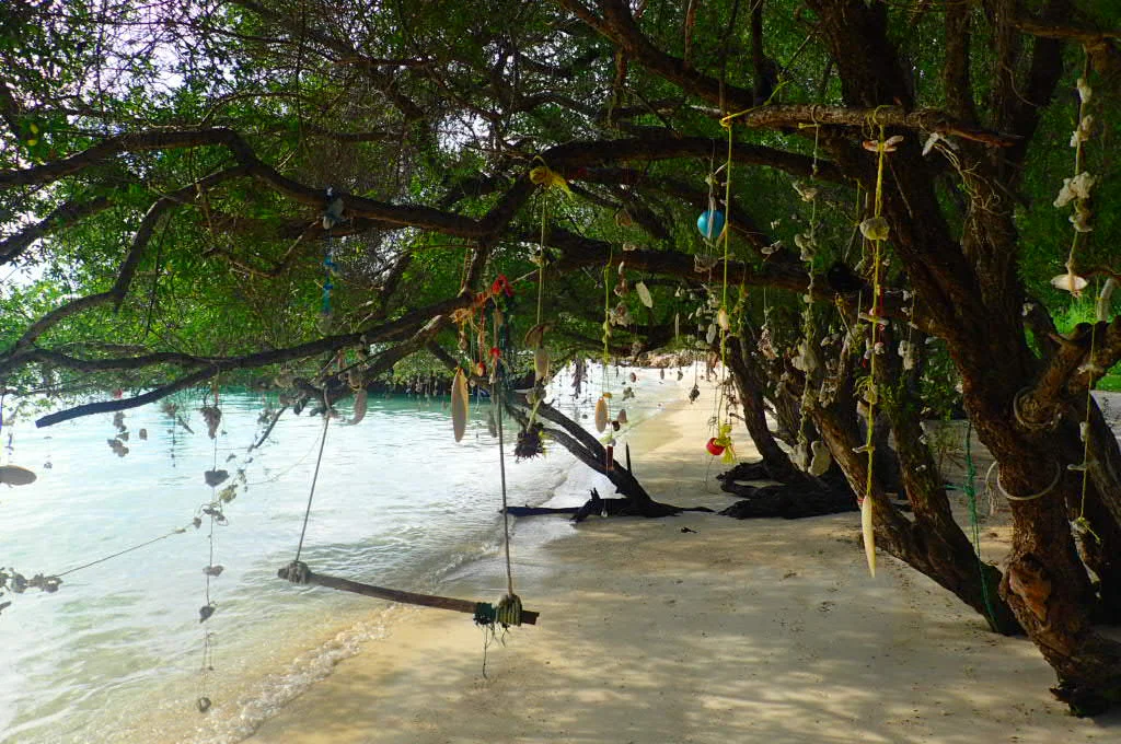 This photo of the children playing above is from a restaurant and bar right by one of my favorite beaches in Chalok Bay. A steep walk uphill and down to the other side of the bay will bring you to Freedom Beach. With its trees right next to the water decorated with hanging shells and pieces of coral, clear aqua-blue water, and smooth rock formations, this spot feels like paradise.