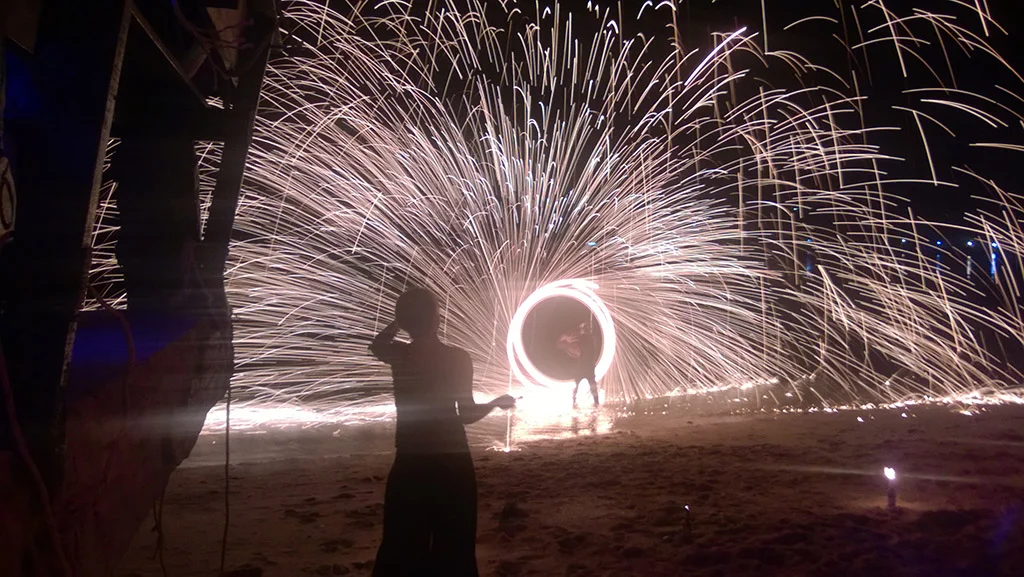 One trick only the Thai man dared was dipping a ball of metal wire in kerosene, lighting it on fire, and then twirling it around real fast to make sparks fly in a great arch. It’s most definitely dangerous—but the effect is like a rainbow of golden light spraying outward.