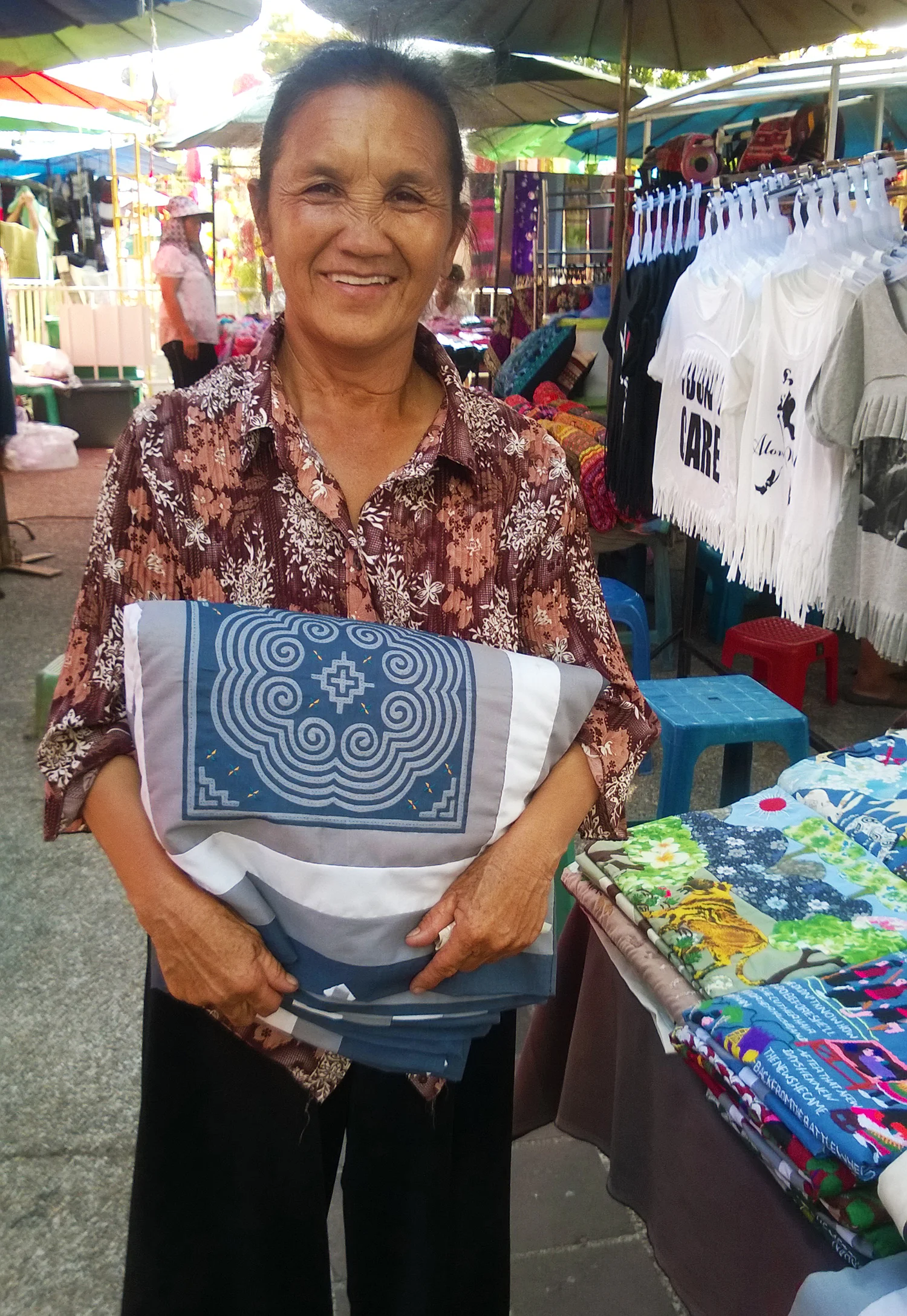 “Hand made. Take 3 month make,” a Hmong woman said, clutching the gorgeous bed cover I had picked out for my parents back home. This was at the Sunday Market. At the Saturday Night market bed covers had gone for around 1400B, but most were stitched with wild colors and patterns. This one was unique—a soft palette with clean lines. My Thai phrases got the conversation started, but she eventually called over a friend of hers in the stall nearby to help with her English. Her price was set at over 2000B. We settled at 1800B.