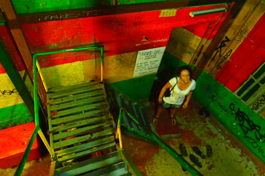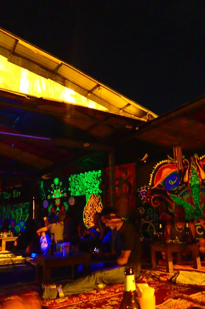At the top, there’s a small bar in a room with a low ceiling and a raised floor made of bamboo slats. Half the ceiling opens up so you can sit facing the psychedelic lighting of the bar and gaze up at the night sky above it.