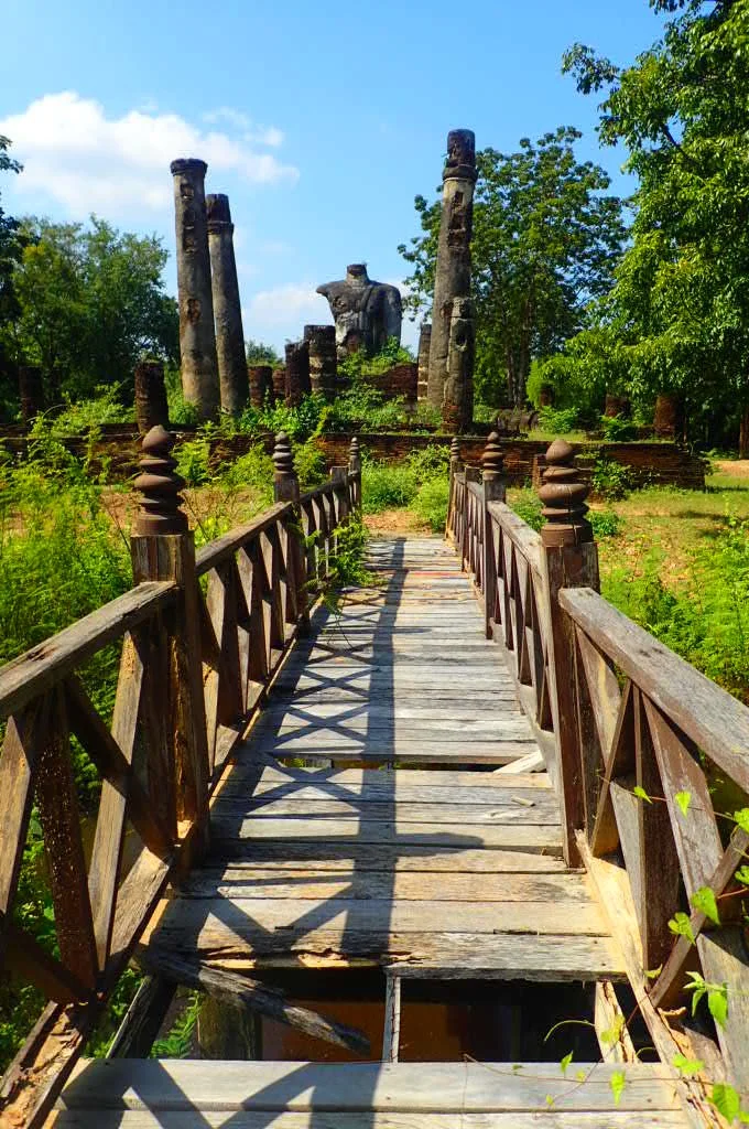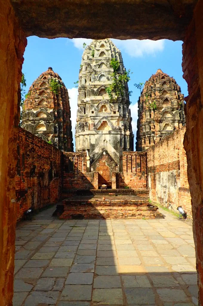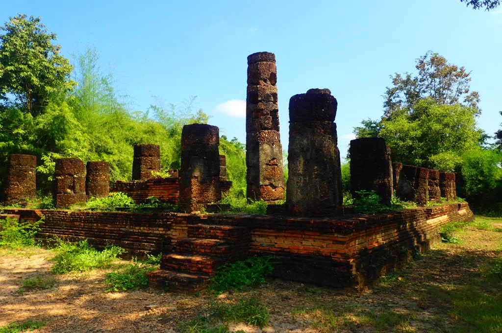 I had an easy time accessing the back area by bicycle despite it being a bit of a rugged path. There were no other people in this part of the park! Parking the bicycle, I could walk the unbeaten path (and unstable bridge walkways!) in solitary up to and around Wat Sangkhawat and Wat Tao Thu Riang to observe all their broken pieces and fallen columns. I could almost imagine what it might have looked like, newly built, and worshipped by the Siamese people who lived there.