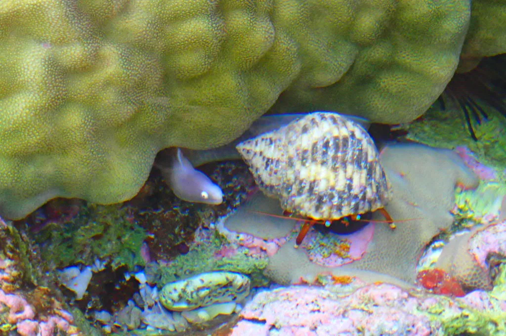 We saw lots of little fish swimming around and even a tiny eel and a hermit crab hanging out together! Cute!