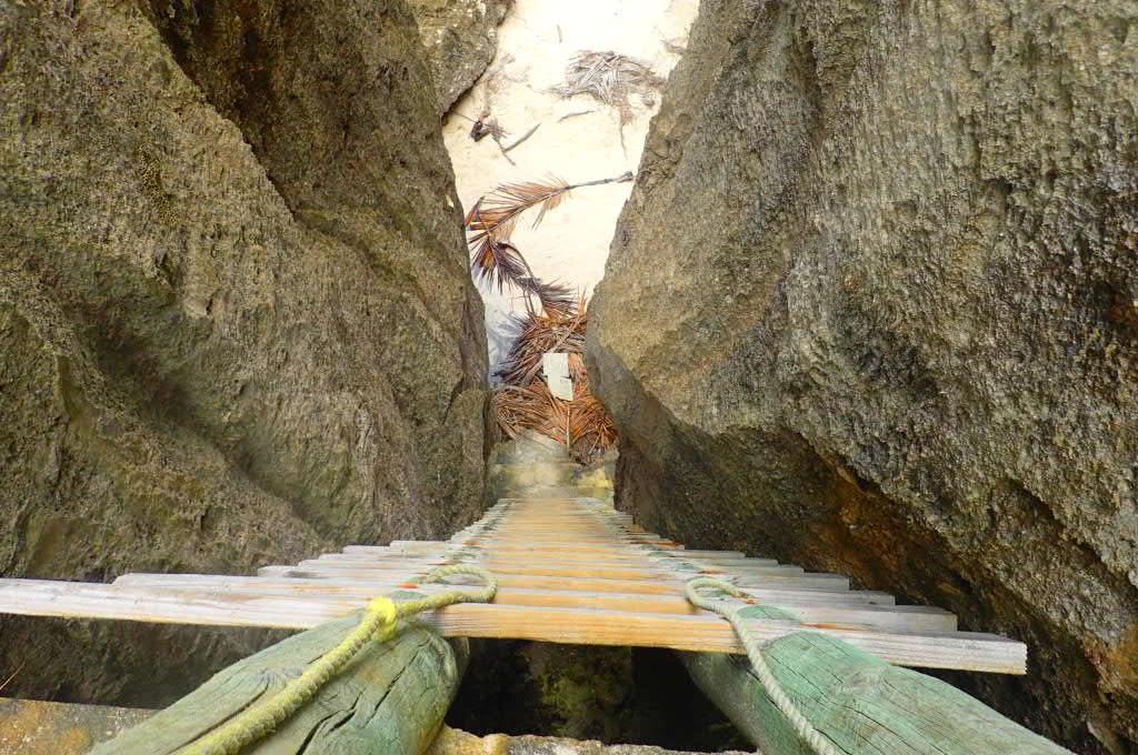 The track takes about a half hour to walk. At about 20 minutes through jungle, the path opens up to sharp, craggy pillars stretching out as far as the eye can see to the left and right. In front, a narrow path was cemented into the rocks, carving its way through down to the Chasm opening.