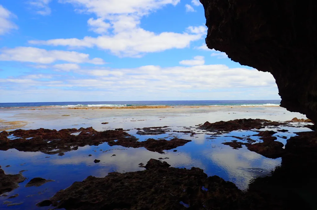 If you go at low tide, you can walk along the reef flats to the North and find an enormous cavernous impression in the rocks. A pool has formed at its base and its walls and ceilings are covered in gorgeous rocky pillars and walk-arounds.
