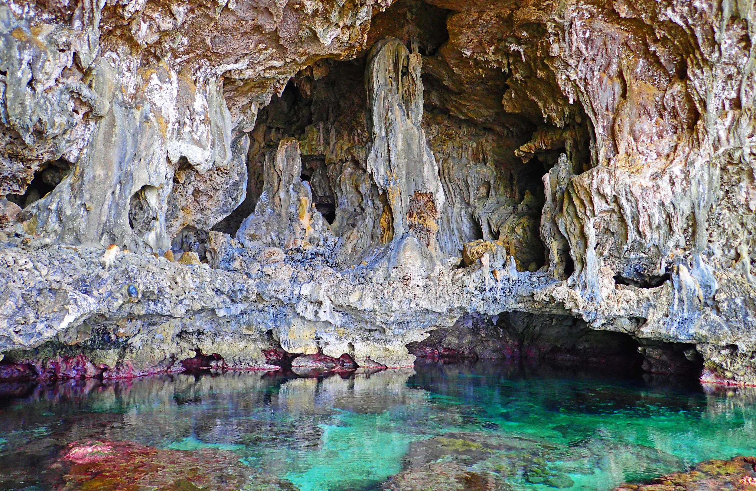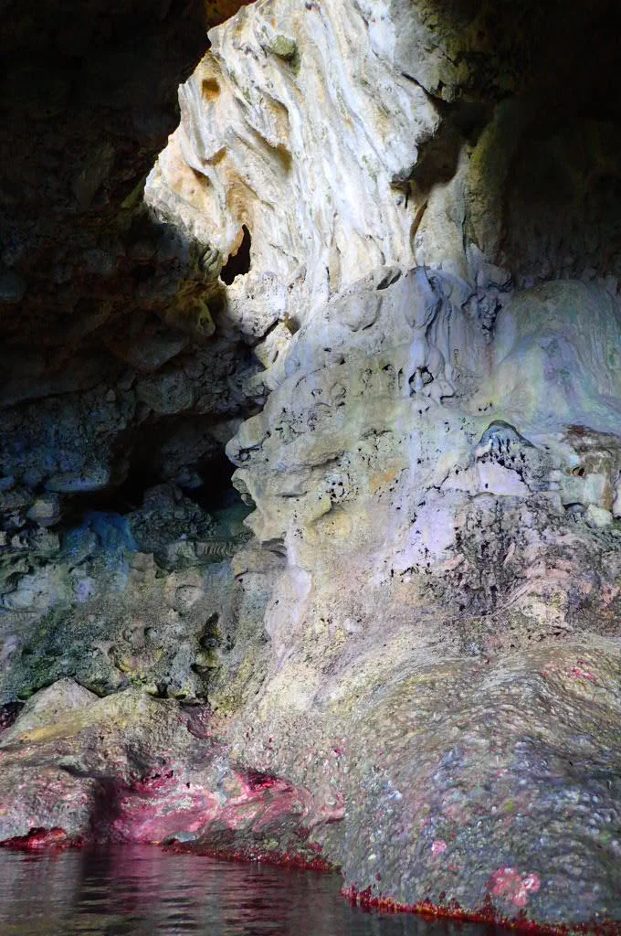 Around the corner from Avaiki Cave is an absolutely unbelievable cave filled with cool water perfect for a snorkel. This cave feels like some kind of fantastical creation imagined up by a surrealist painter. I was obsessed with the view of all those grey, pink, purple and orange colors blended into the extravagantly formed limestone pillars.