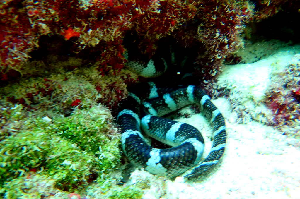 We chose to head down the ladder first and this pool had a swim-through under an archway leading out to the reef flats beyond. Underwater inside the swim-through was our first sighting of a banded sea snake!