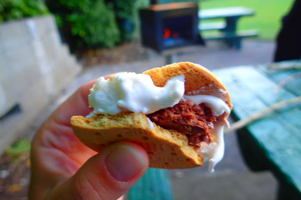 Before leaving Turangi, I said to the guys “In United States, camping is not camping without s’mores.” I learned Harald had never heard of or tried s’mores and Marek had loved it when he tried it during his travels. So we went to the store to pick out the ingredients. Alas, New Zealand does not have graham crackers, they hardly have marshmallows, and there’s no Hershey’s here—blasphemy! I had to settle for biscuits, weird pink and white baby marshmallows, and Whittaker’s chocolate.