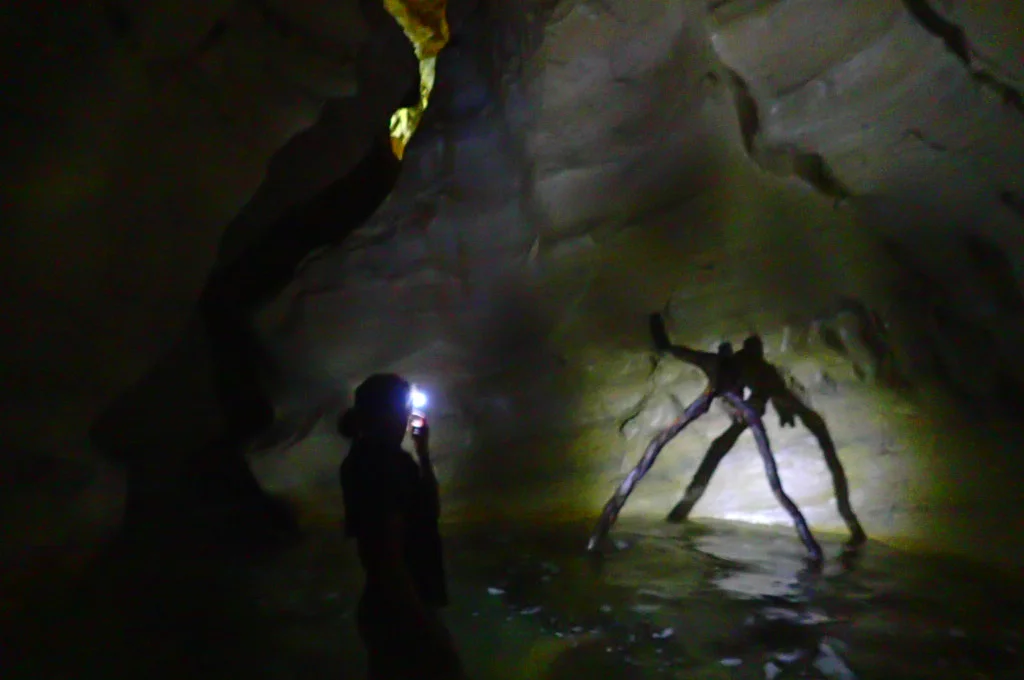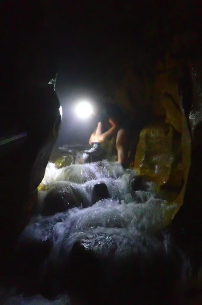 With our headlamps on, we made our way into the pitch darkness pushing against the current of the stream water.