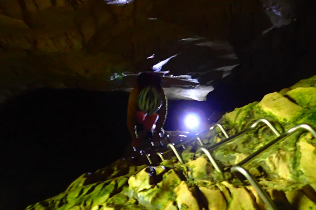 The stream was strong in several parts of the cave. We seemed to be heading up hill slightly which meant there were waterfalls to climb in various spots. The water was so strong it actually untied our shoe laces several times over!