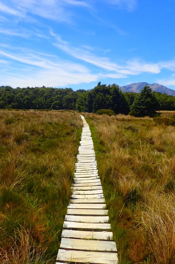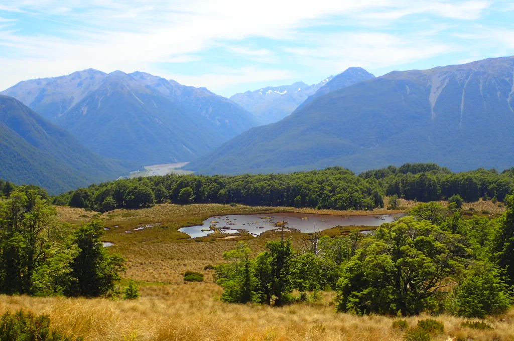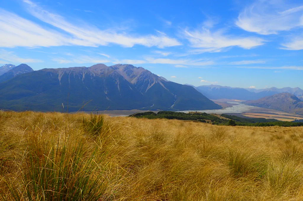 The trail continued through grasslands and passed mountain tarns (or lakes). At this point, the views of the Southern Alps came into sight. We could see the entire glacier-carved valley below.