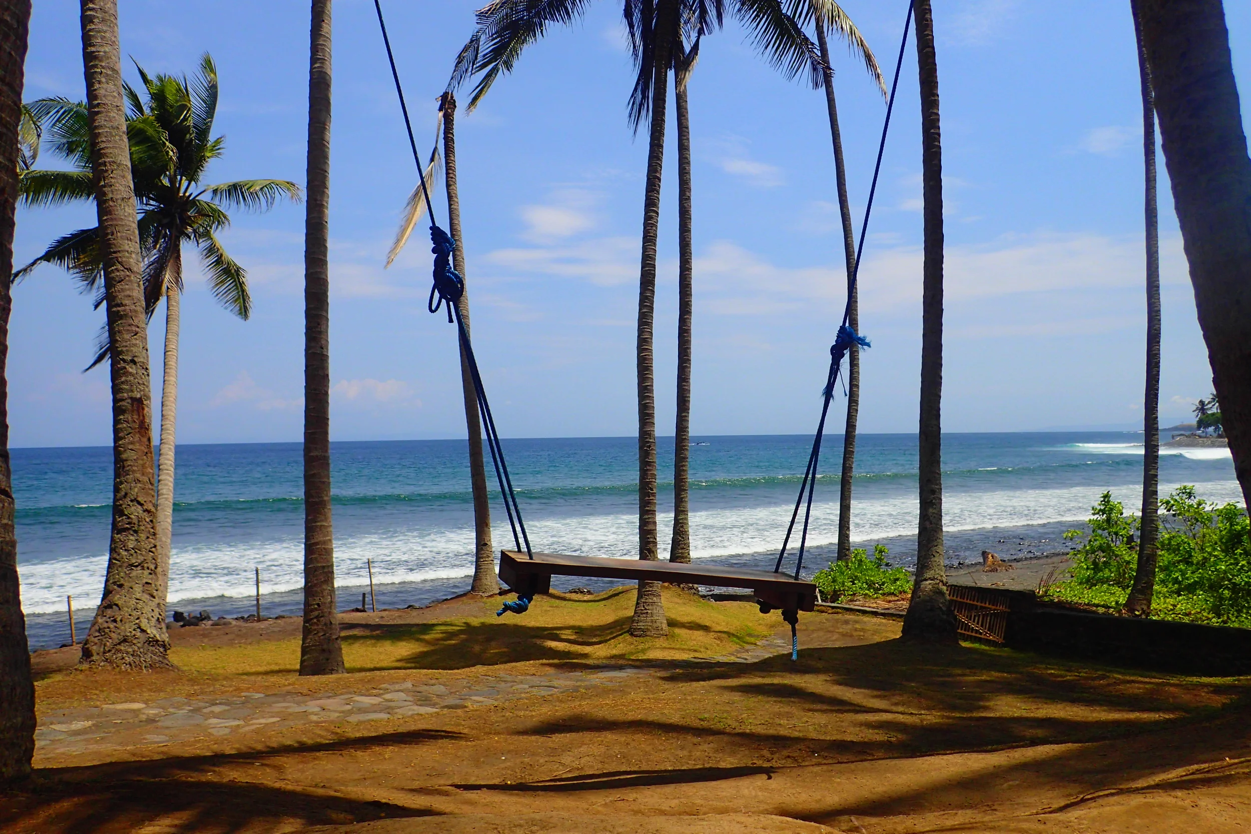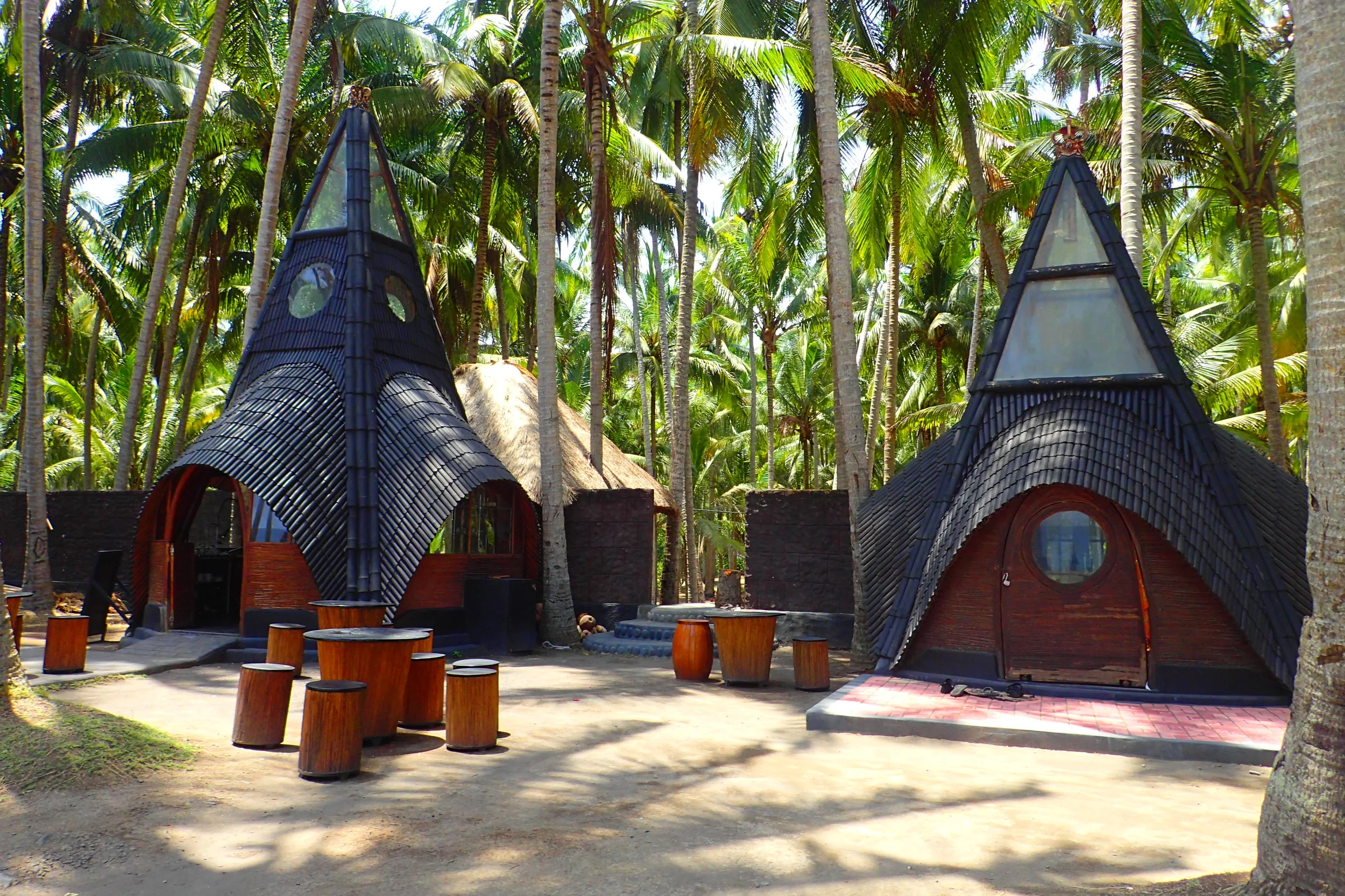After turning down a side road and paying a small toll, we rode a narrow dirt path between towering palms toward the beach. Emerging seemingly out of nowhere we came upon a few little houses set up between trees.