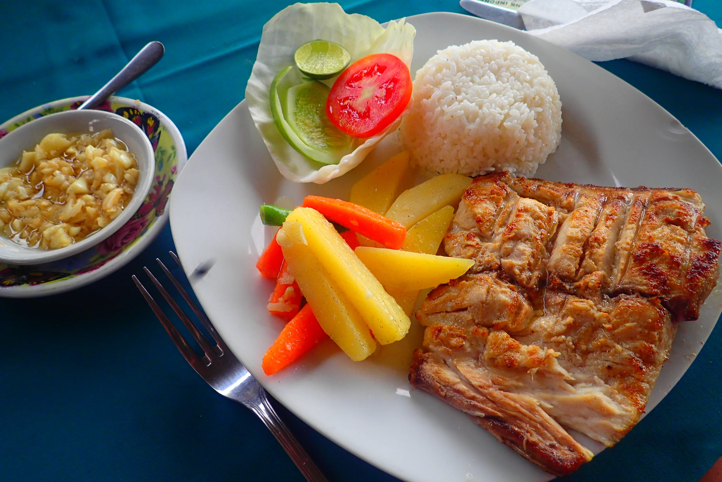 The white fish was fresh and lightly grilled, served with a sweet garlic salsa and a side of rice and vegetables. So yum!