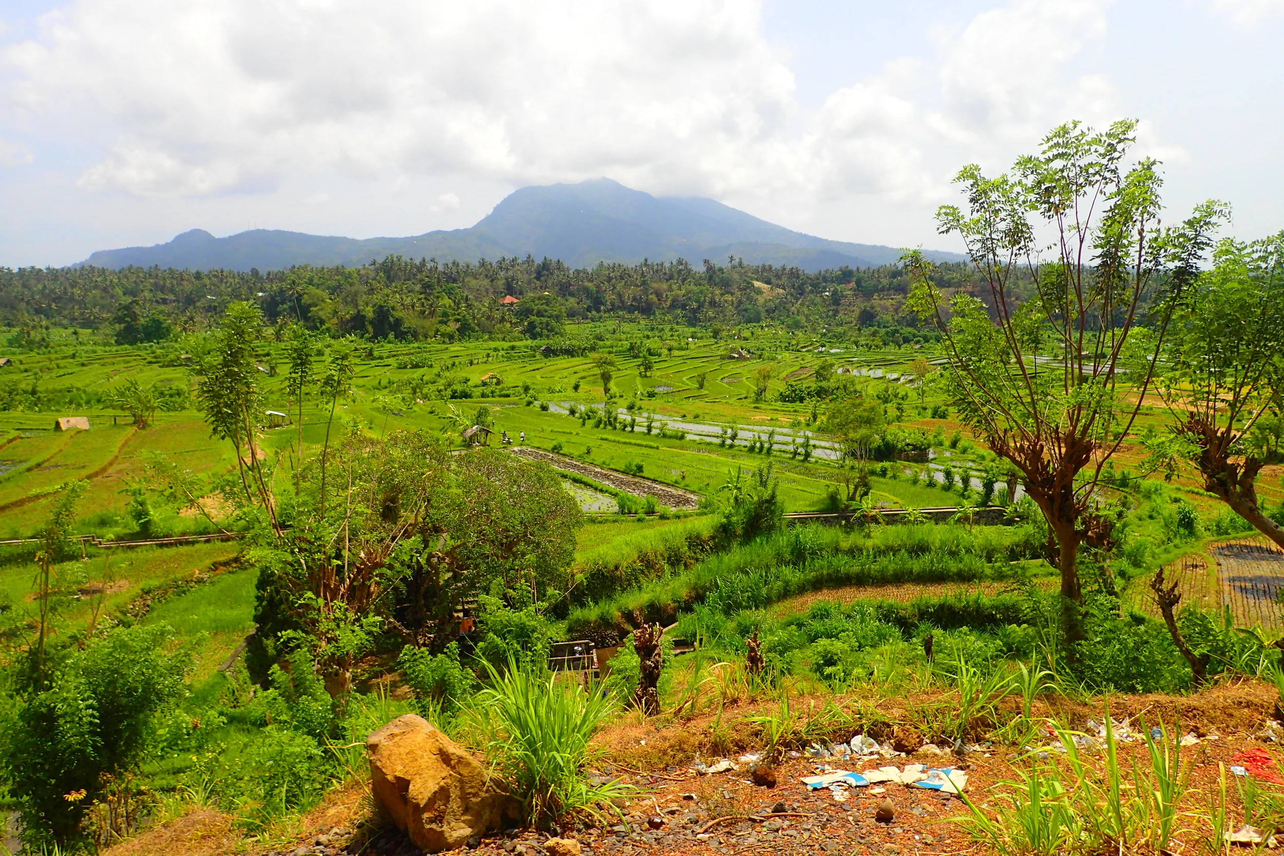 After Tirta Gangga, we took a long, steady drive down from the upper countryside to reach another water palace called Ujung. On the way, we stopped on the roadside to snap photos of Mount Seraya in the distance across farmland.
