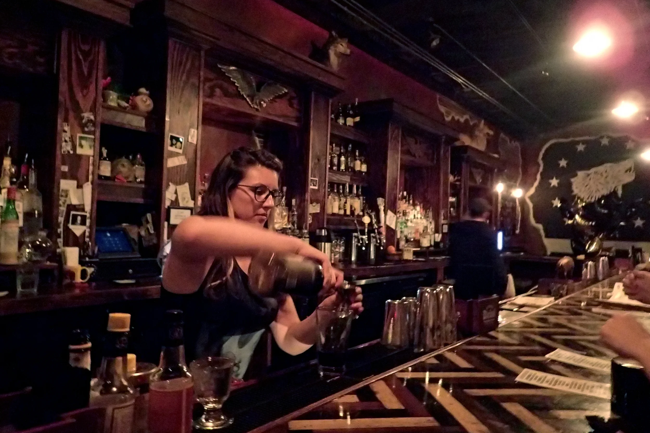 The light inside The Crying Wolf was shadowed and the theme was taxidermy and dark woods with industrial, pipe work ceilings. They had cocktail specials like the "F-Word," a pop-up thrift store, and an entrance to a room where bands were playing.