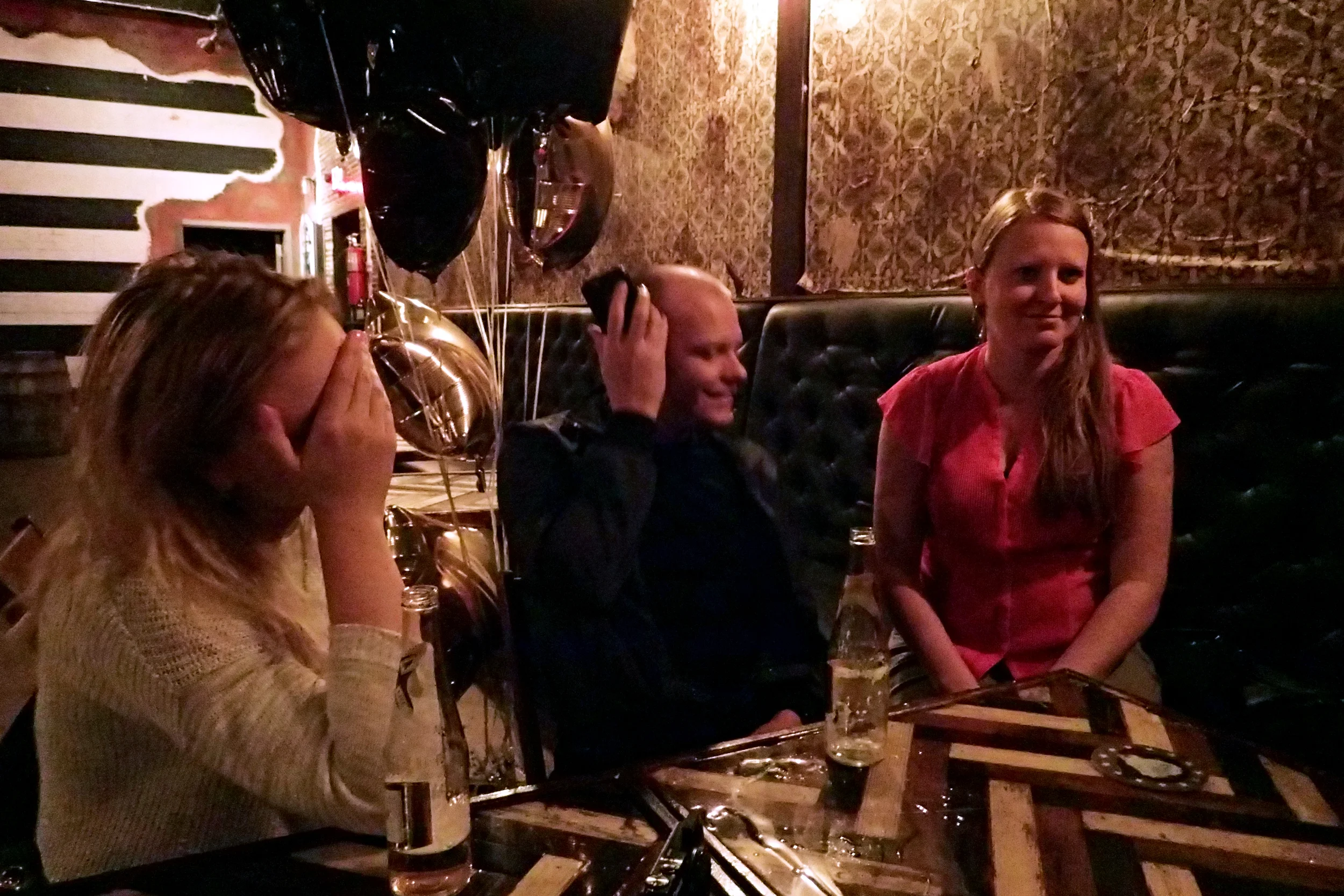 Dasha loves taking photos like me, so her initial reaction was to take photos of her friends sitting in the booth before sitting down to drink. I encouraged her to get in the photo with them so that I could have her camera at the ready for the big surprise.