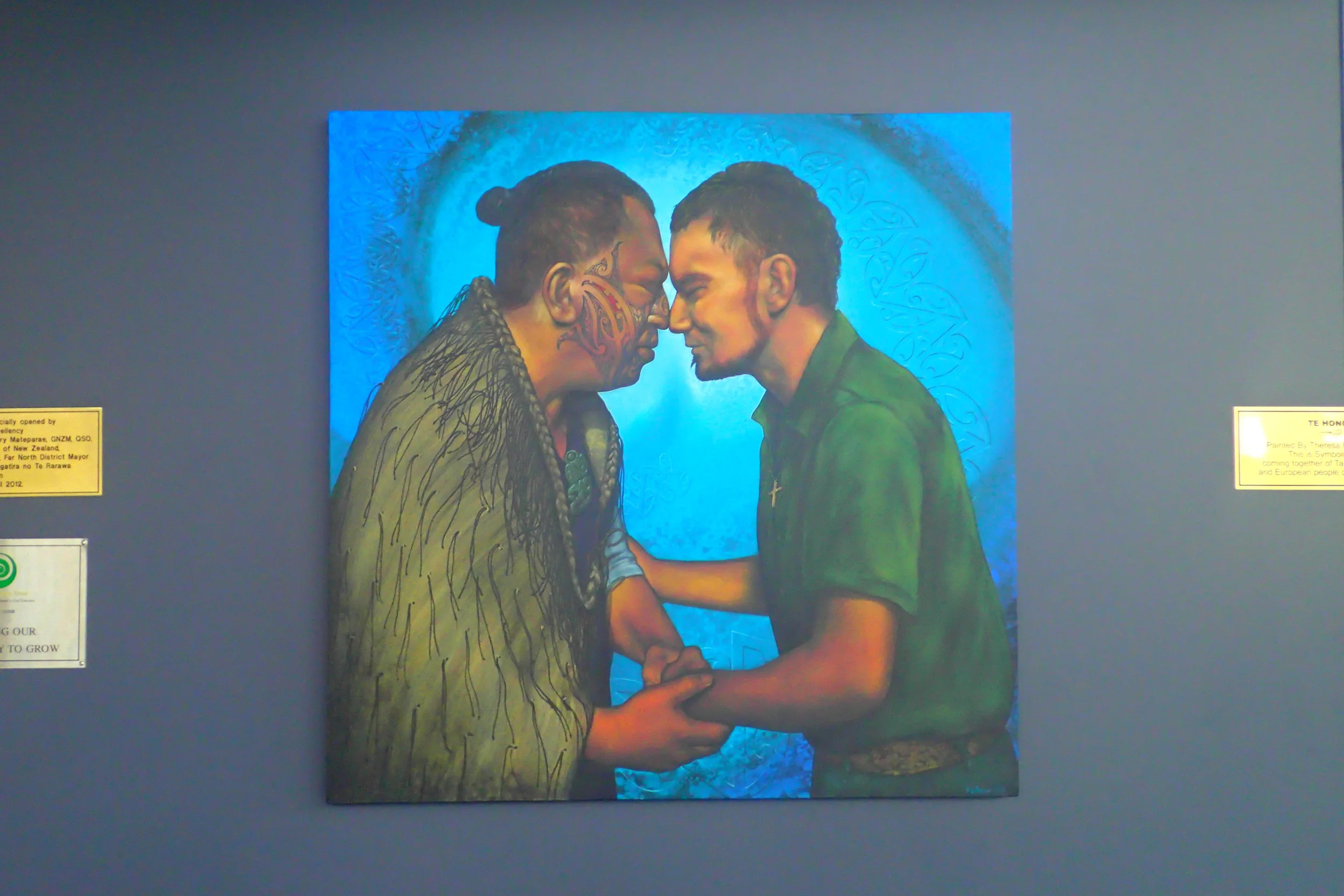 At the Far North iSite in New Zealand, this painting hangs representing the traditional Māori "hongi" — a greeting of pressing of the noses and foreheads together