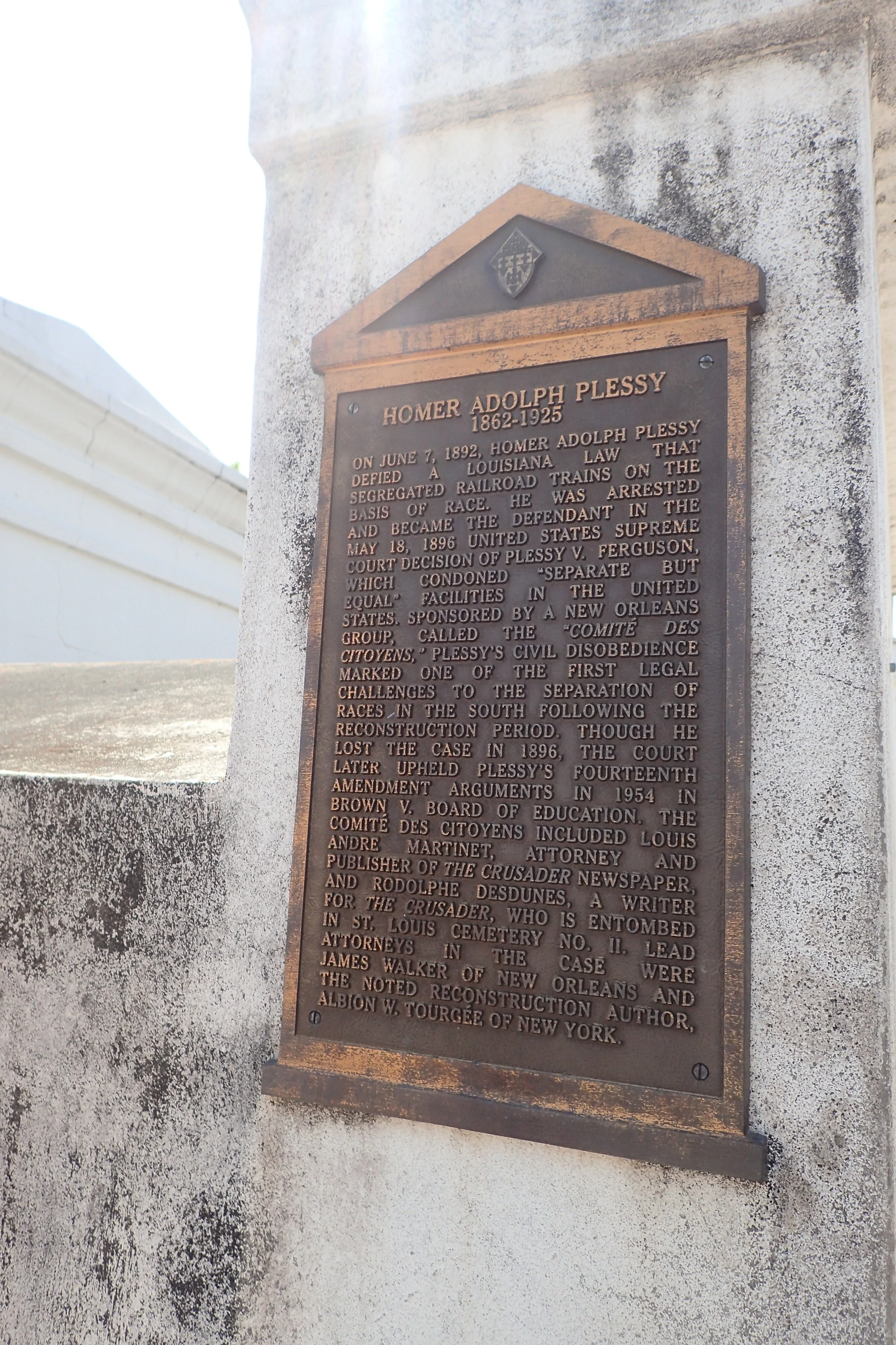 Lastly, this one may be a scary reality check for you, as it was for me: Homer Plessy of the famous Plessy v. Ferguson court case is buried in this cemetery. Racial segregation was alive and well and pretty awful in the 1890s when Plessy deliberately boarded a white-only rail car. As a light-skinned male, Plessy "got away with it" until he voluntarily told the conductor he was one-eighth African American which would qualify him for the black-only car under the Separate Car Act.