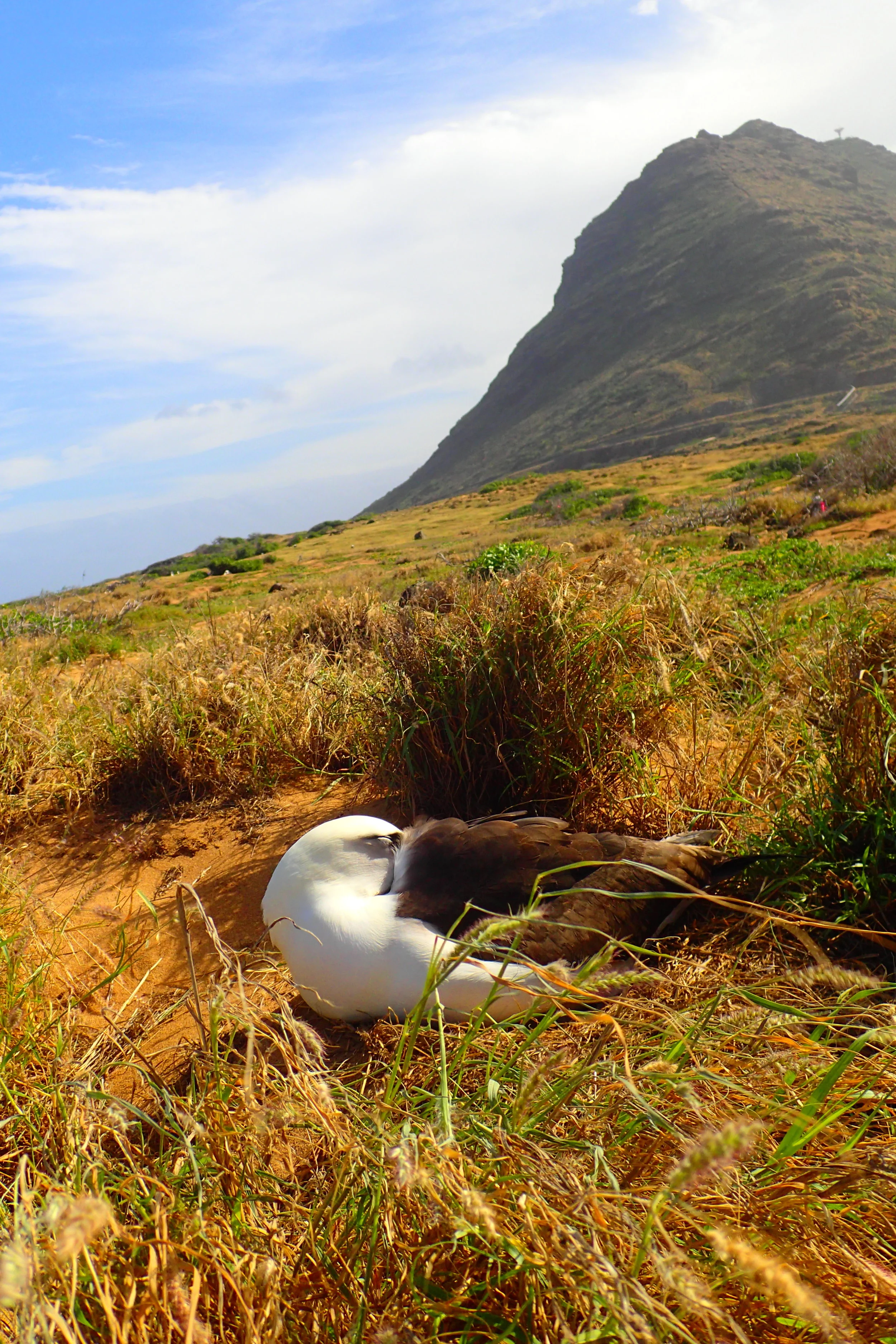 The road ends when you reach a gated area. This is the entrance to a reserve that protects the nesting seabirds found in the area. When I was there in January, I spotted dozens of albatross greeting their mates and sleeping in the grass.