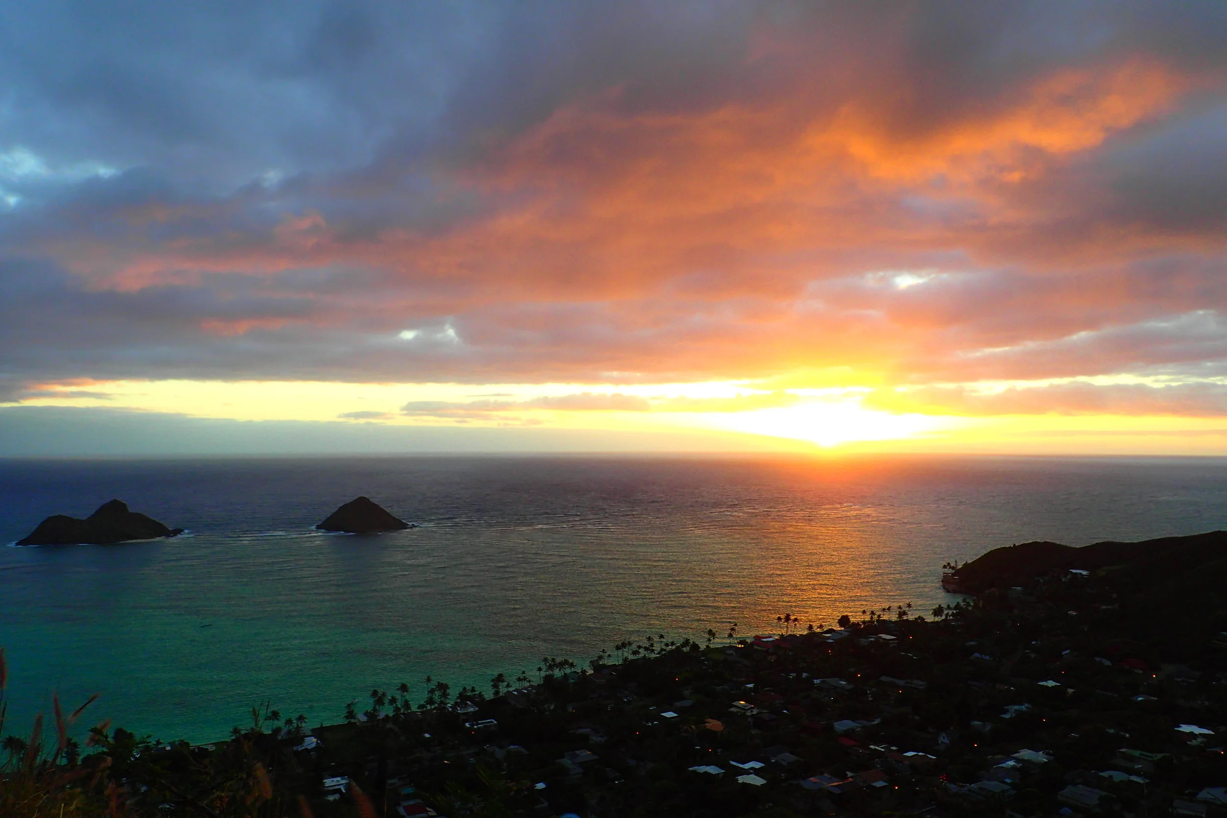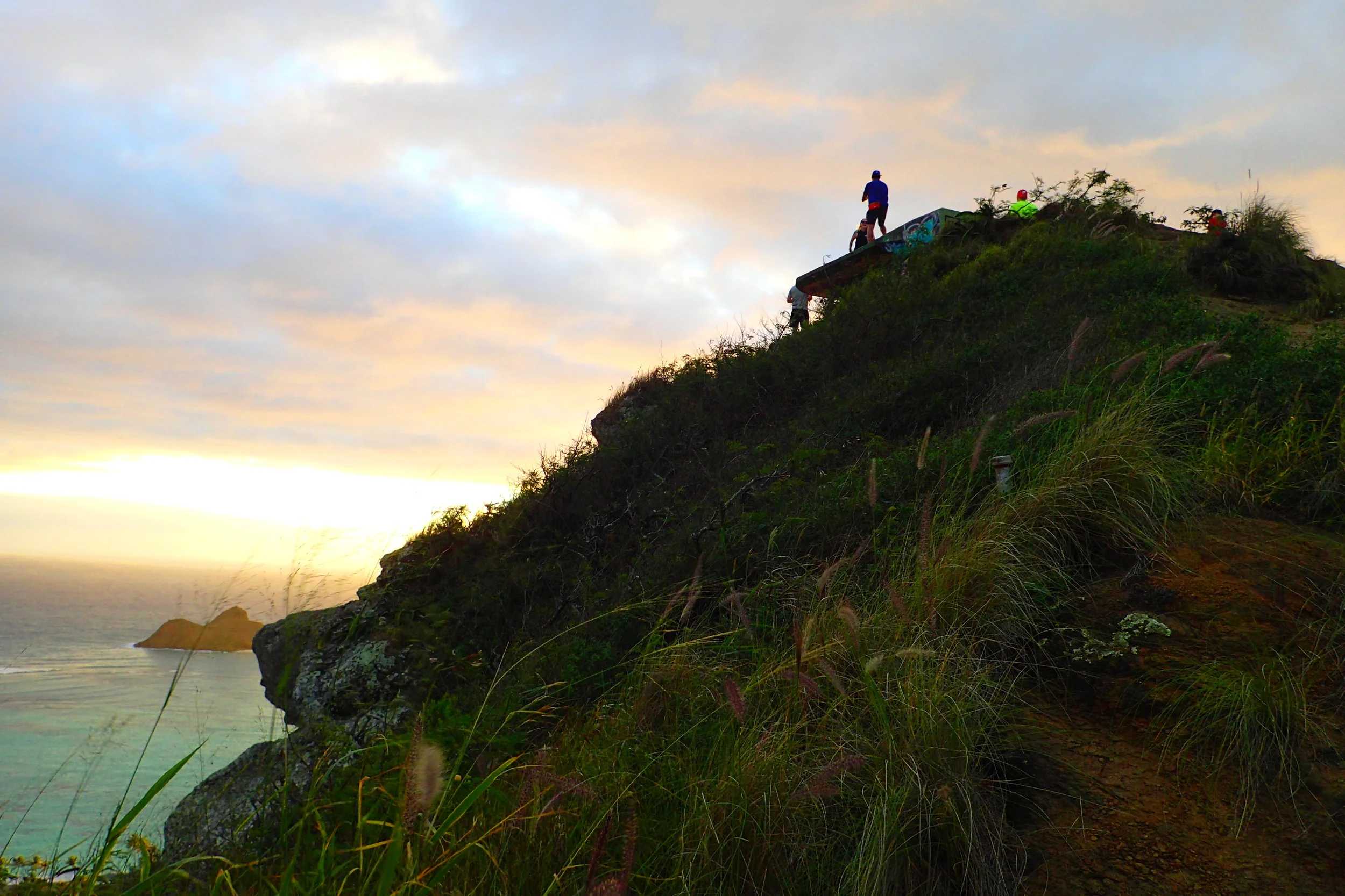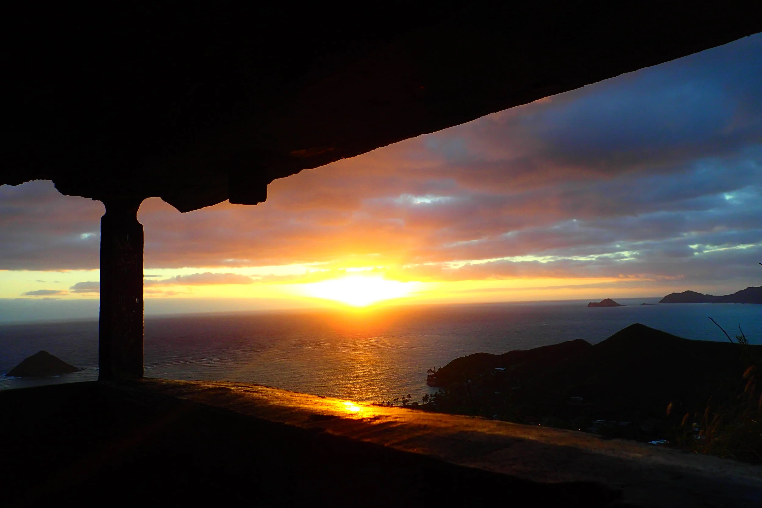 The WWII "pillboxes" (guard posts) on this ridge hike are as famous as the stunning sunrise views. The ridge overlooks the Lanikai neighborhood. Below is Kailua Beach, Lanikai Beach, and the "Moks" (Mokulua Islands).