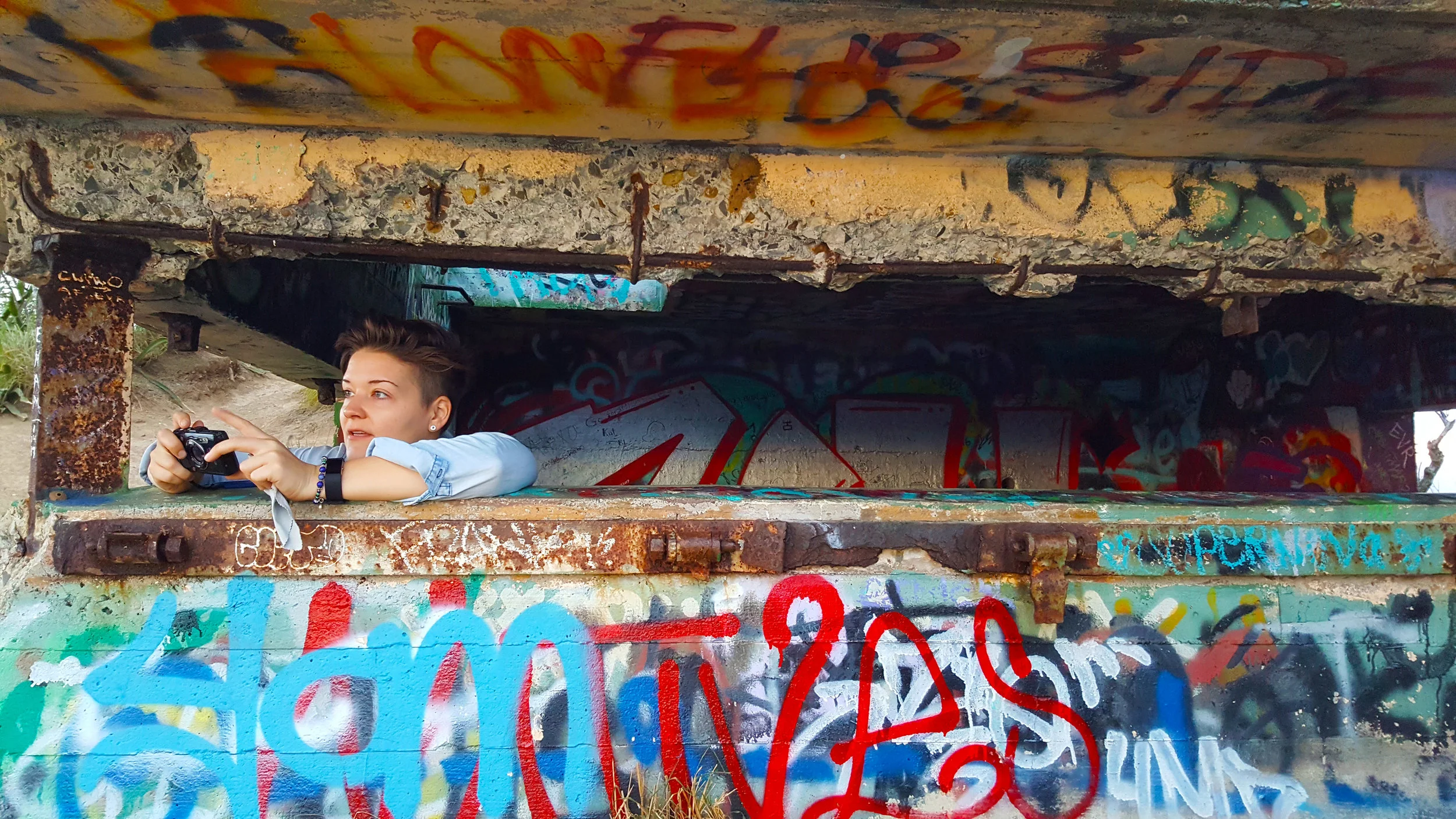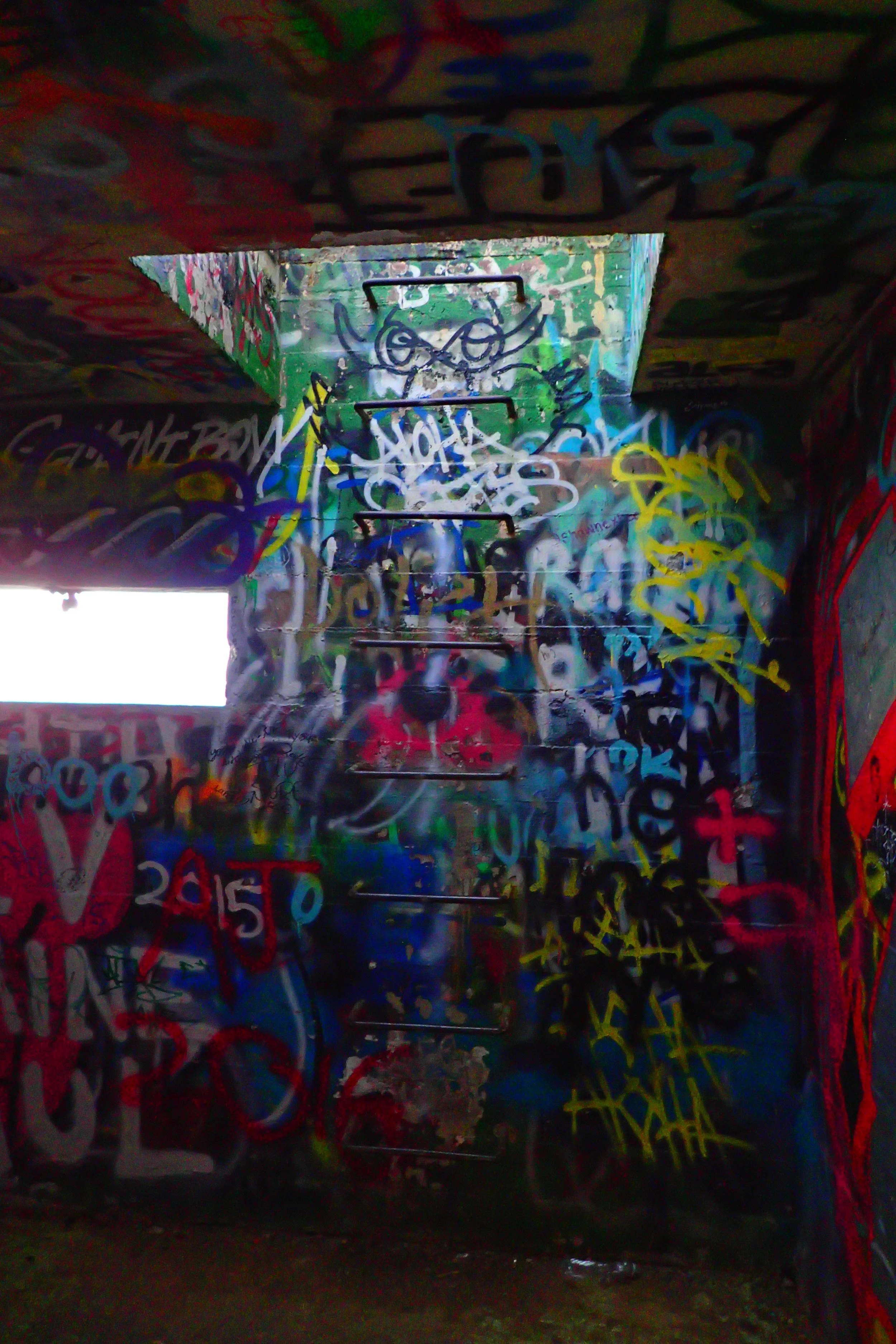 I explored the pillbox as I waited for the sun to streak the clouds in vibrant light. I could drop down a ladder inside the pillbox and view graffiti on its inside. The windows looking out at the surrounding views was like peering into another world.
