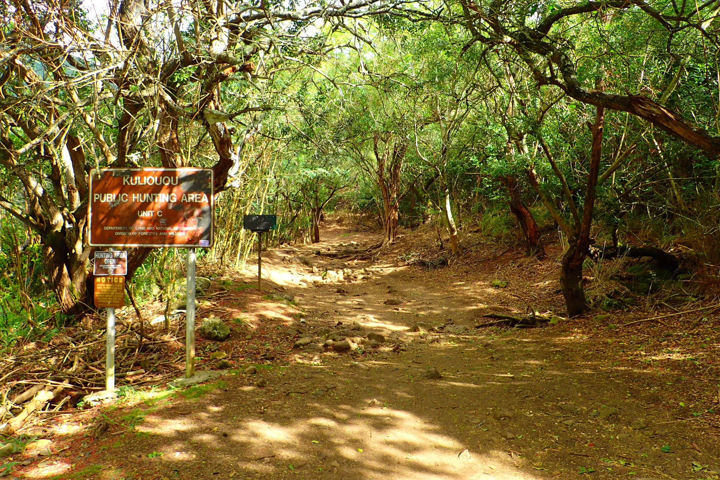 By far my favorite hike of all, the Kuliouou Ridge hike starts at the end of Kalaau Road. Find a spot clear of driveways to park your car. Walk down to the dead end to find a paved path leading into the valley. Take a dirt path to the right at a sign that says: "Na Ala Hele Hawai'i Trail & Access System." You're on the right trail if you see the "Kuliouou Public Hunting Area" sign.