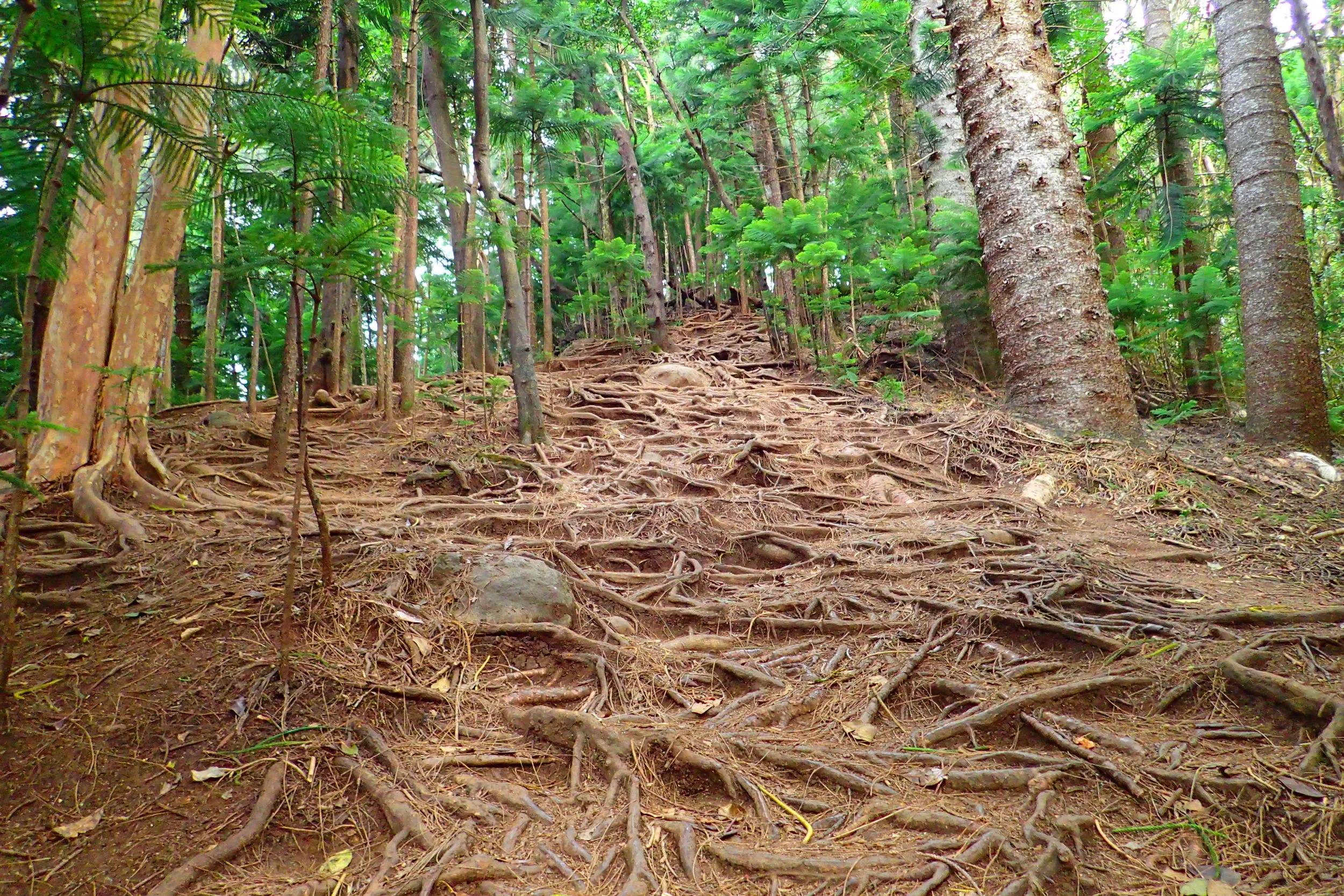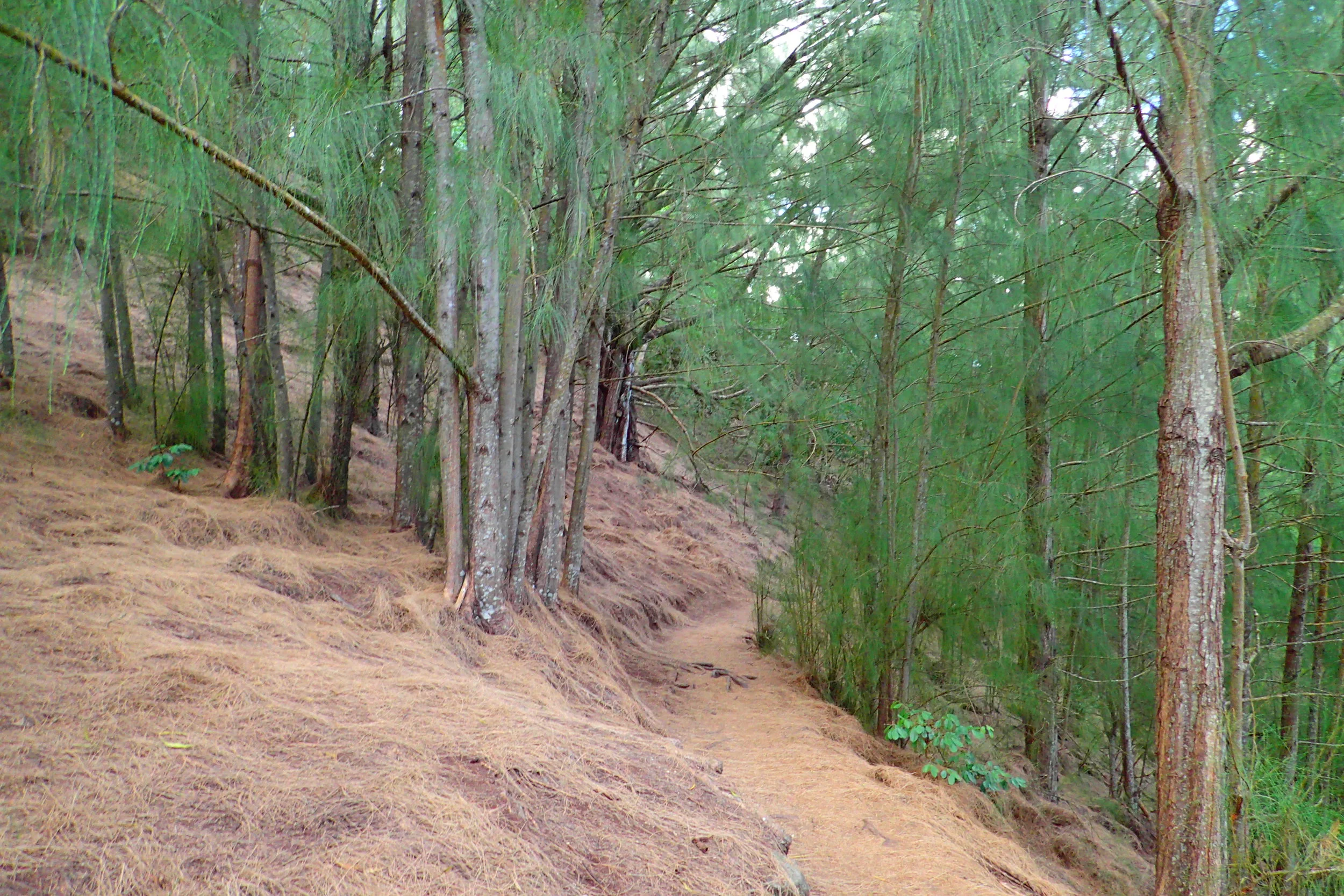 Switchbacks will take you through a steep jungle forest. The foliage will turn to Ironwood trees that provide a thick pine needle bed to cushion your path.