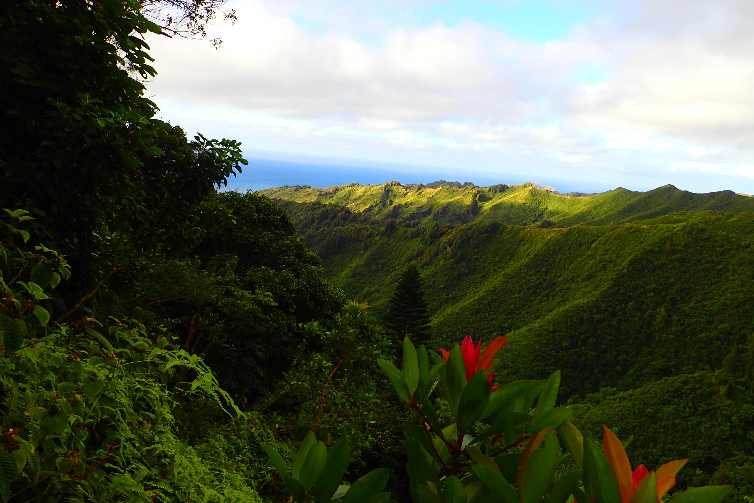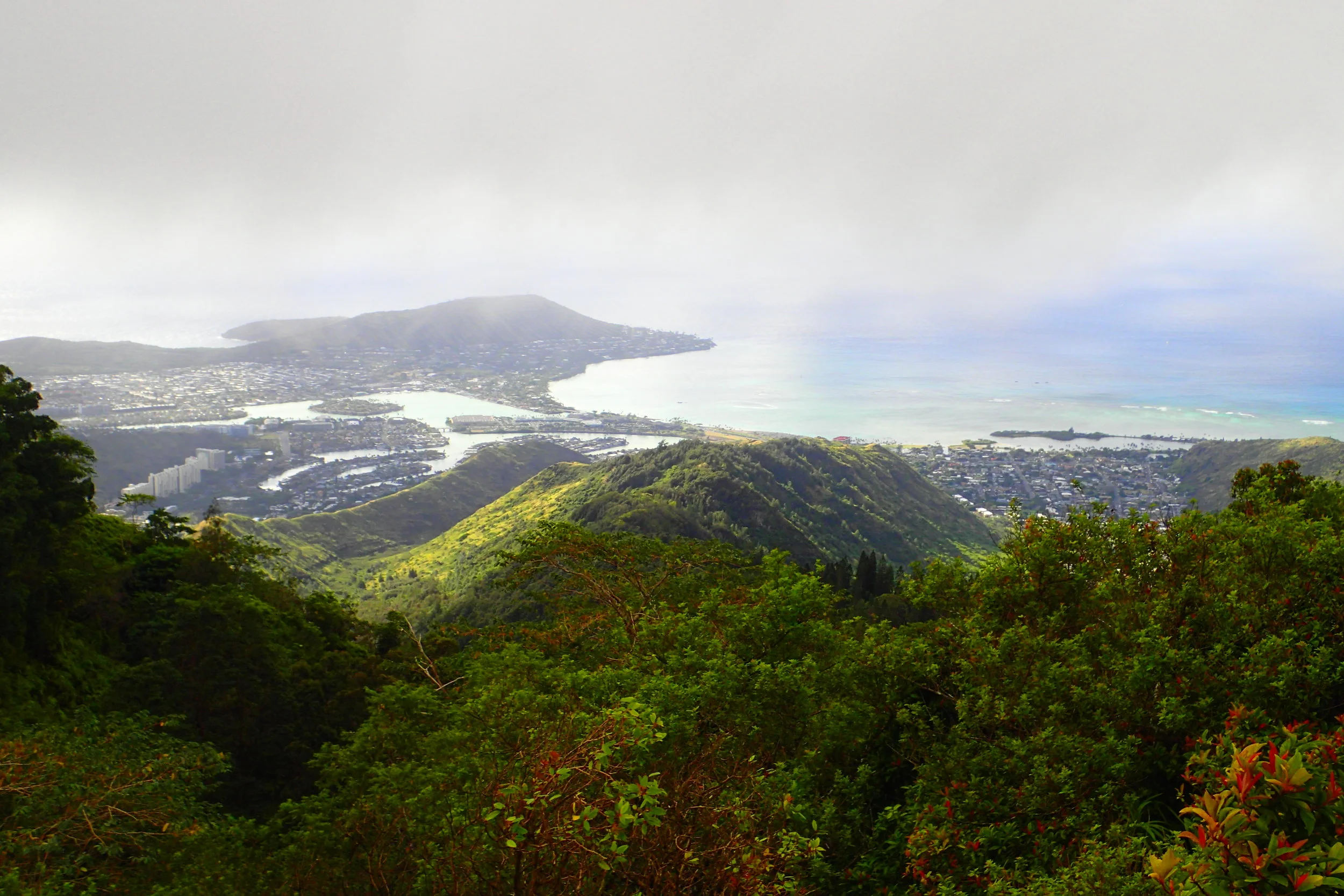 Peak holes out from the forest will give partial views on the way up. You'll see Hawaii Kai and look out across the valley to the next ridge over in the Ko'olau range.