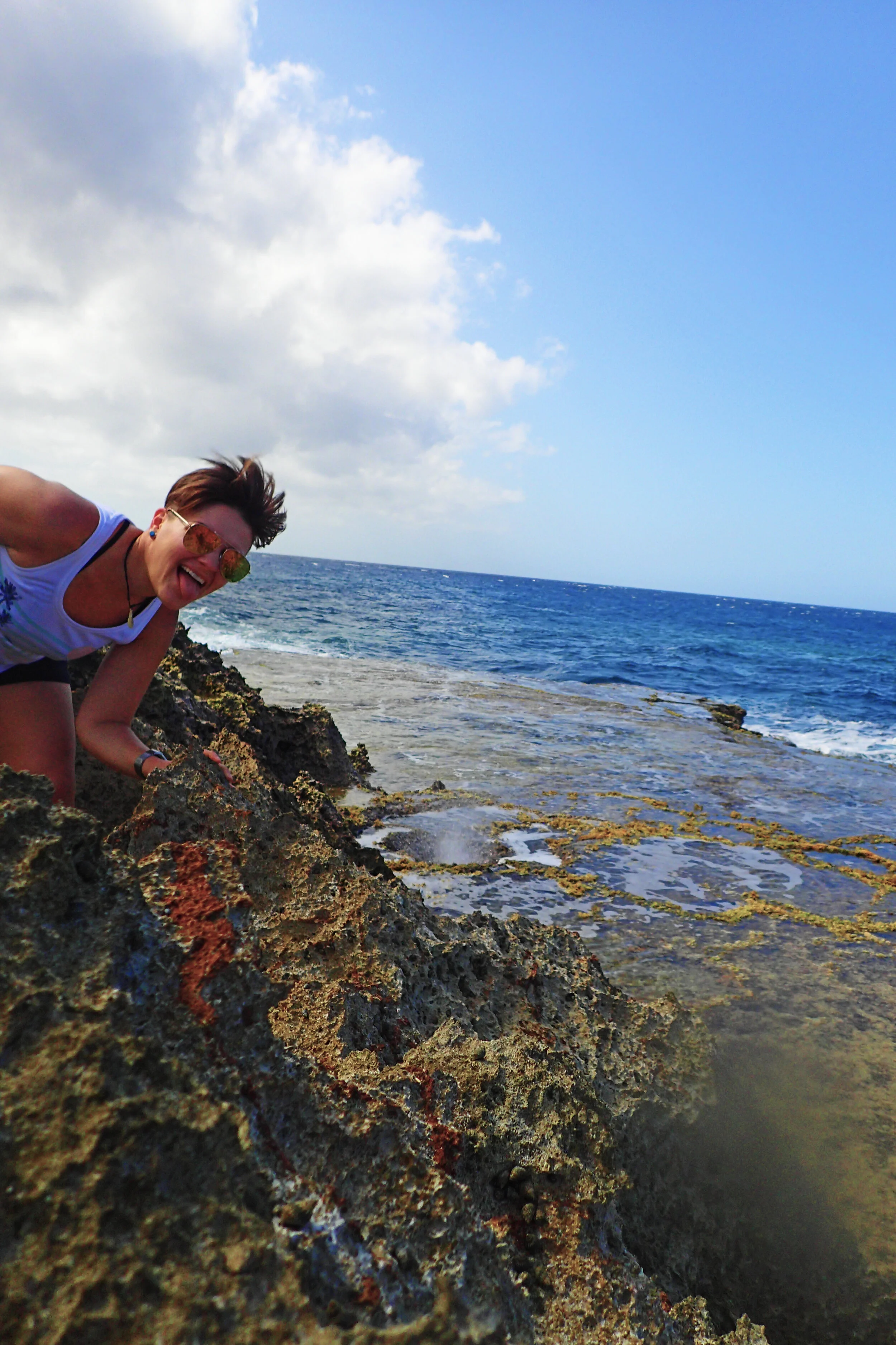 Setting up my camera solo without being able to time it right with the sprays was a challenge. The sun kept going away or the timer wouldn’t go off in time. I set the timer and then carefully and quickly picked my way across jagged rock to get into position each time. While I managed to get a few decent shots, I also manage to cut up my legs on the coral a bit!