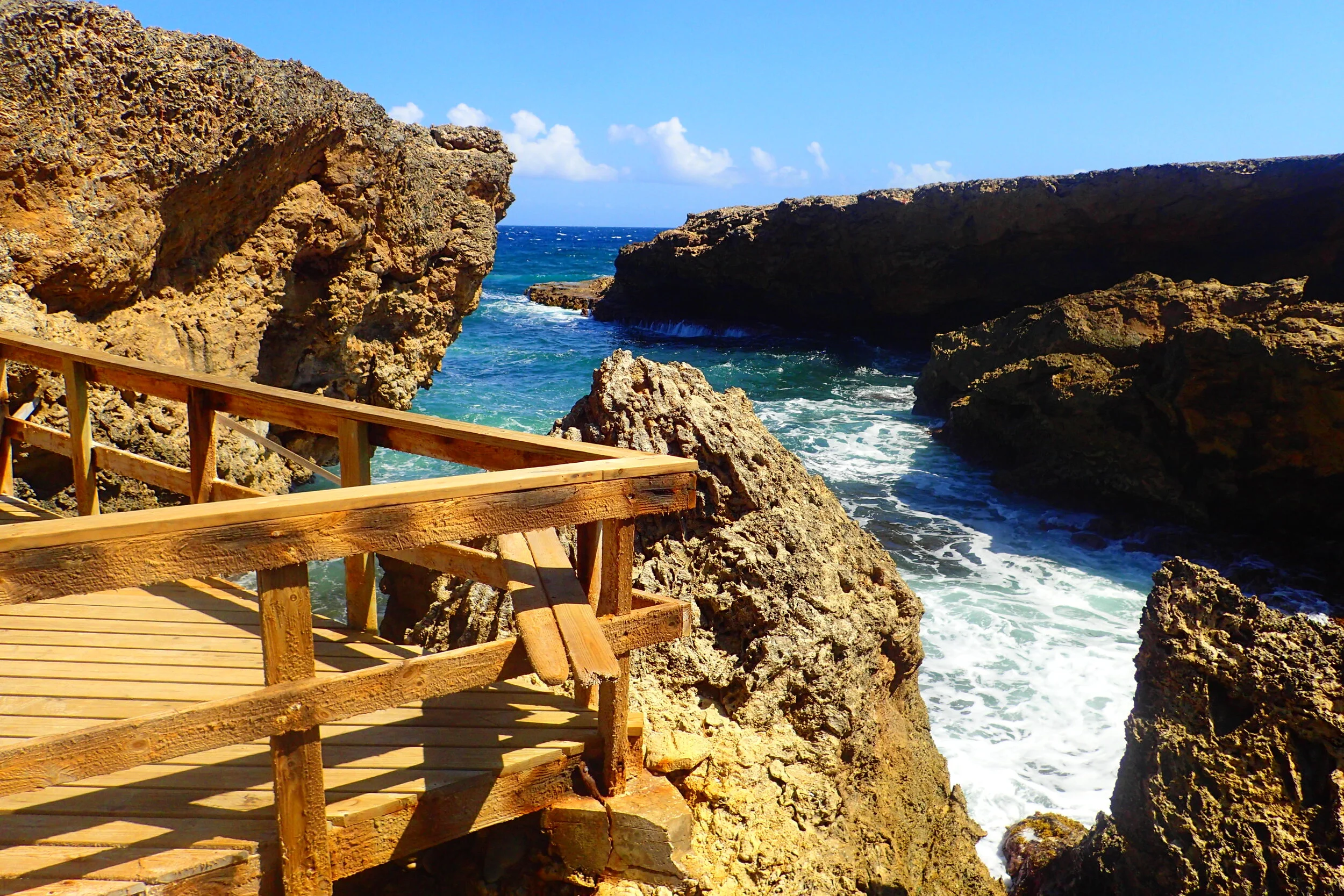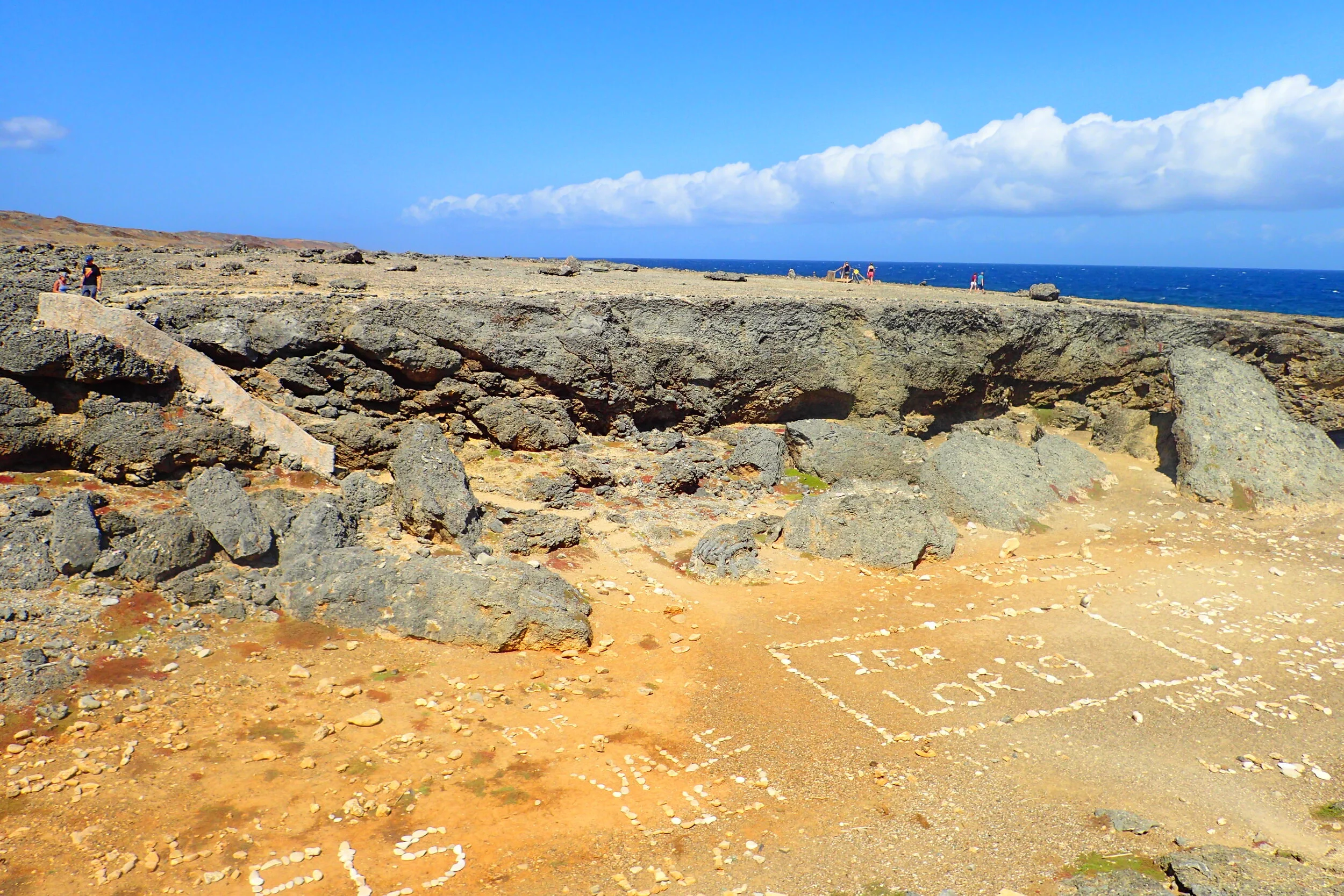 Boka Wandomi requires a bit of a walk from the main parking lot. The paths go out to look out points and also work their way across one inlet where people place white rocks to create messages. On the other side of this inlet is another inlet where you can walk to a viewing platform to see a natural bridge.