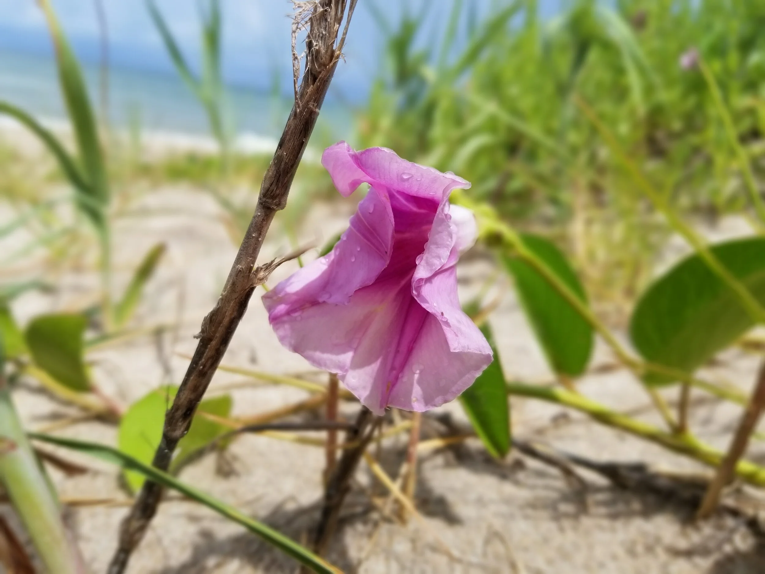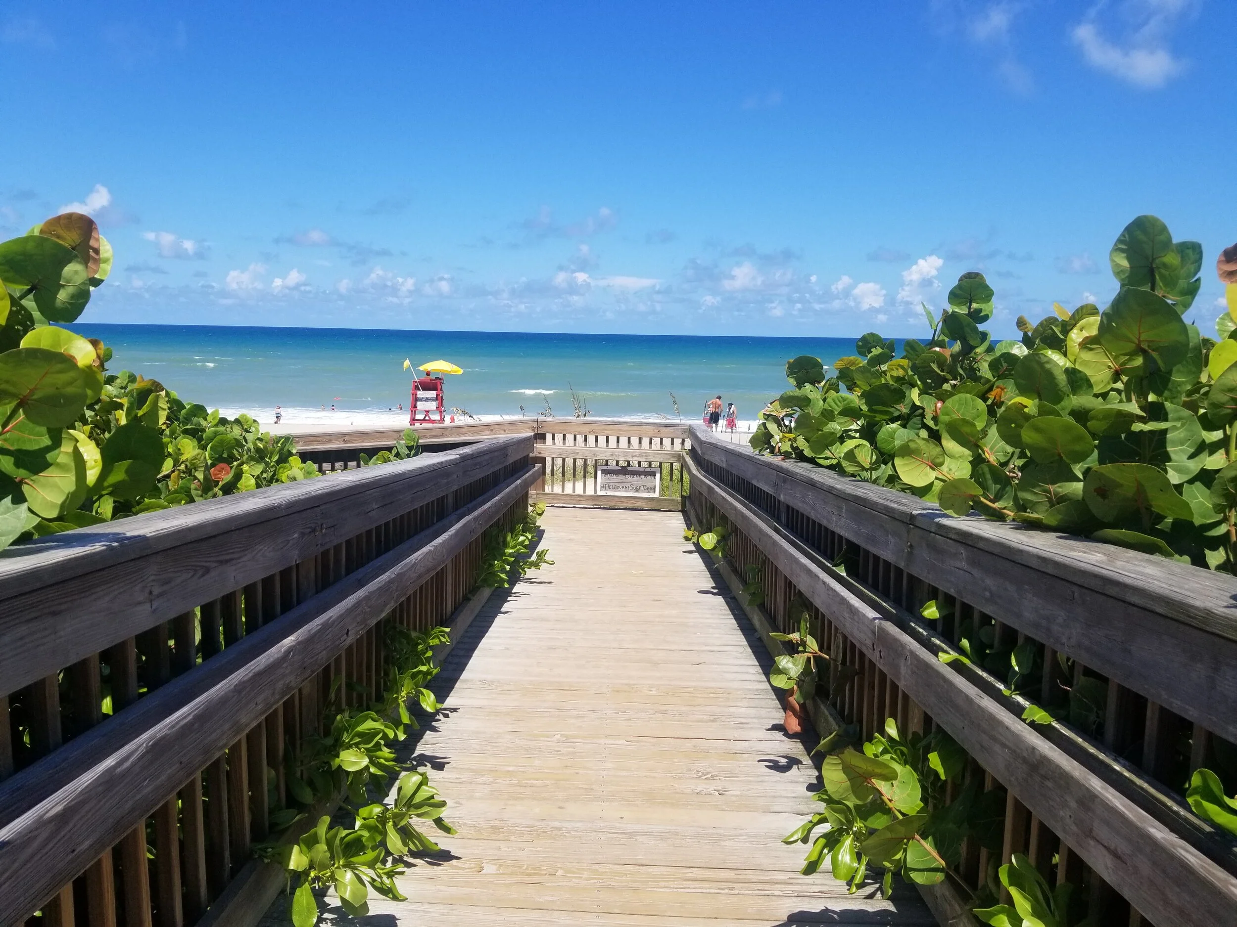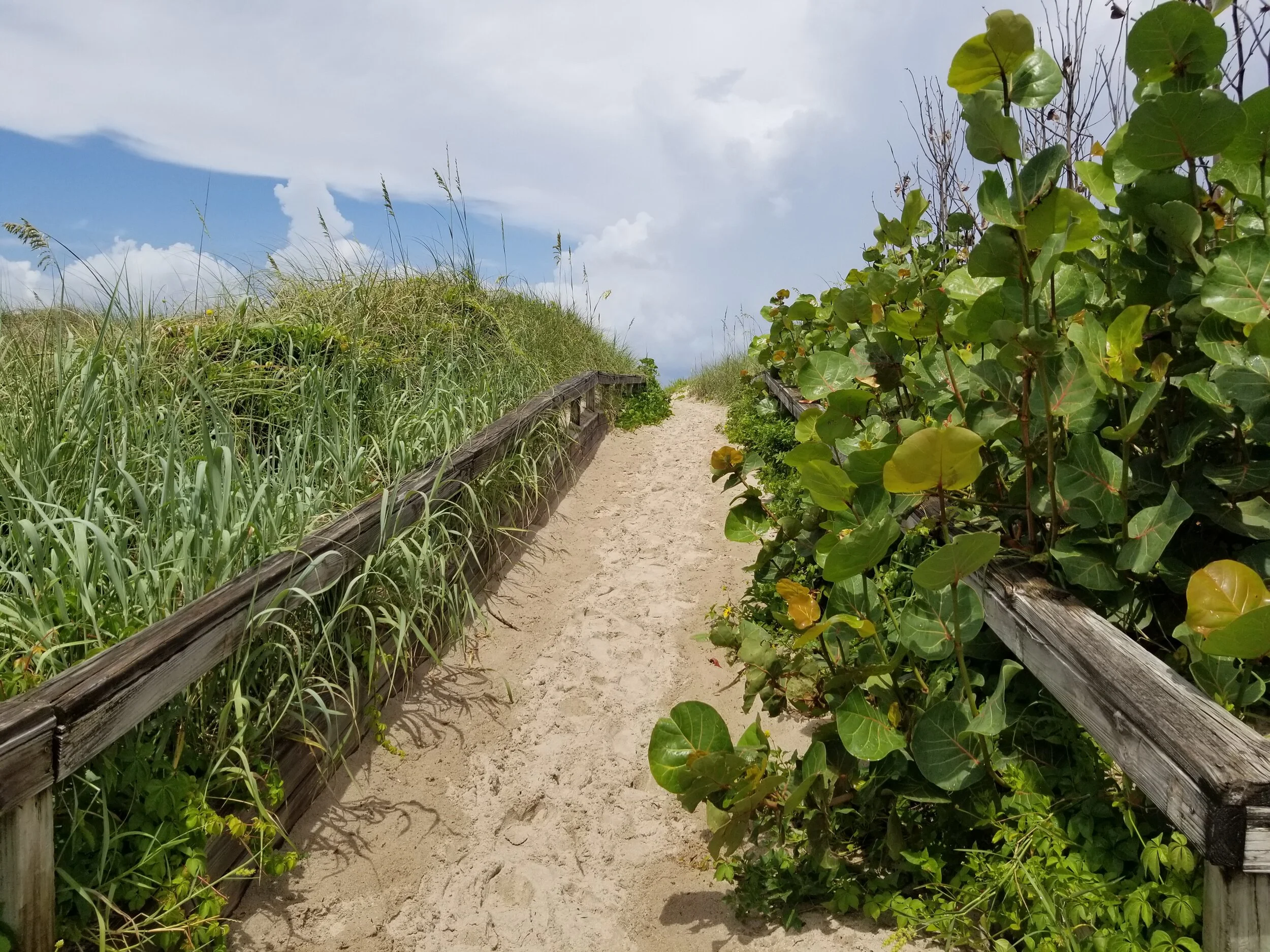 I love the entranceways to the beaches in Florida. The paths typically have pretty green plants on each side. This beach even had beautiful purple flowers in bloom.