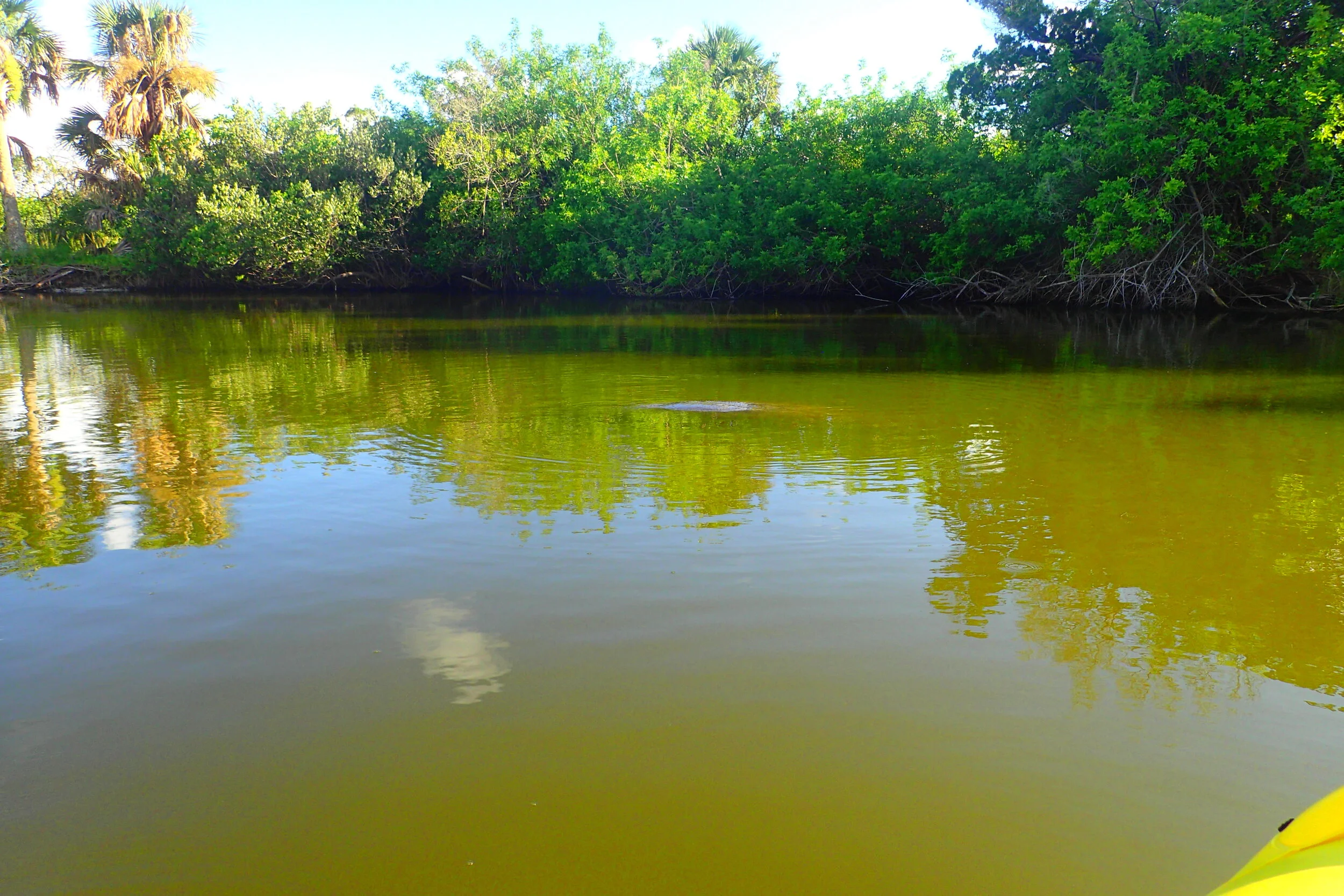 Manatees are hard to spot, especially when kayaking at surface level with them. I found that the best way to spot them is to look for their big snouts. They stick them up out of the water to breathe periodically (every 2-15 minutes). Sometimes, I stopped paddling and just listened for their breath. That helped me spot them before they submerged themselves again.