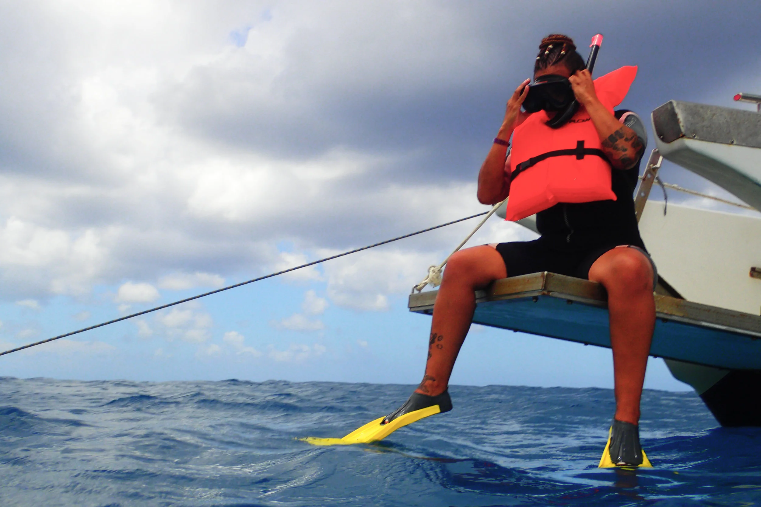 Ang unfortunately got rained on between snorkel sessions. A passing tropical rain cloud came through and blasted her and the captain. She was a good sport about it, though—she enjoyed being out on the water, regardless!