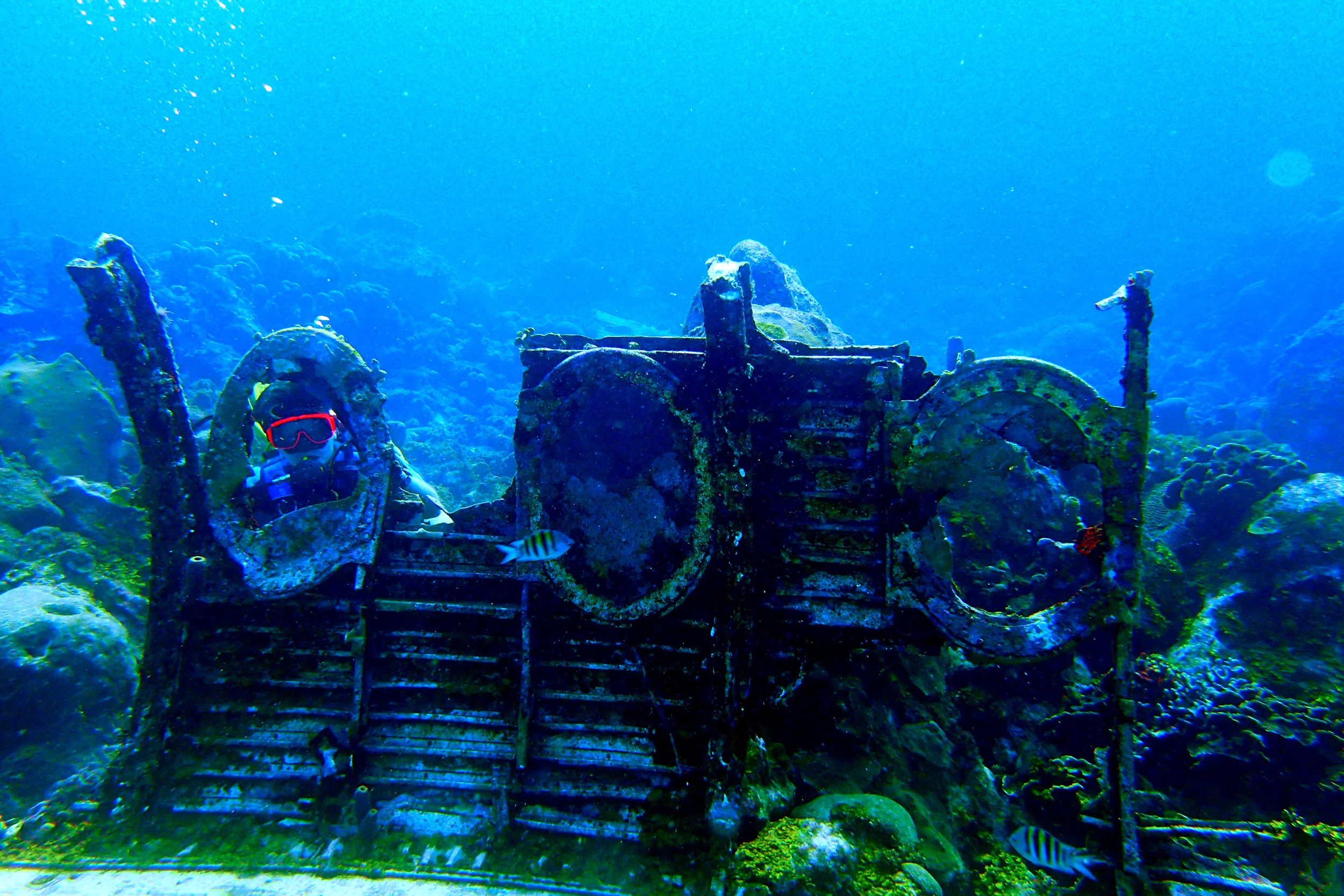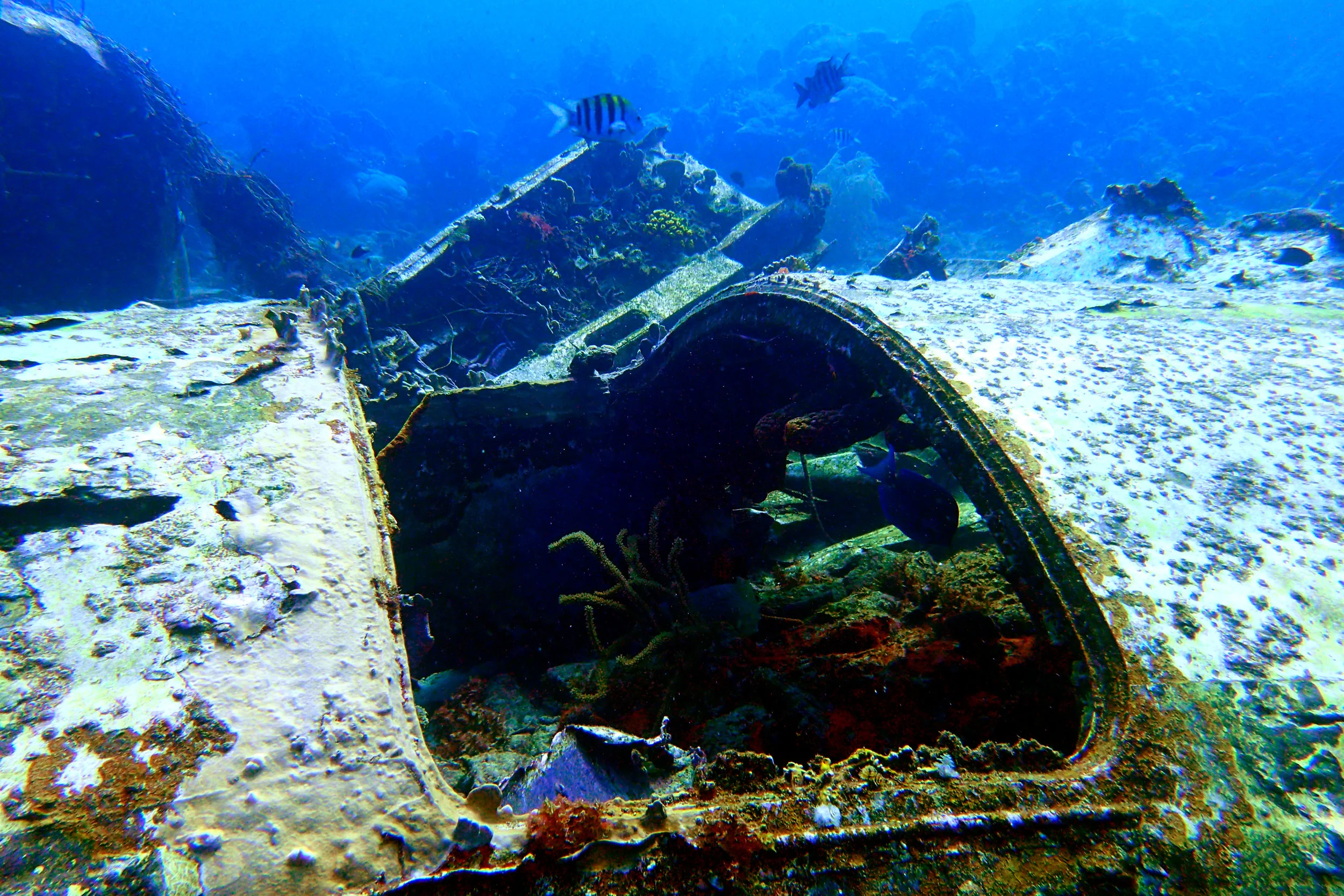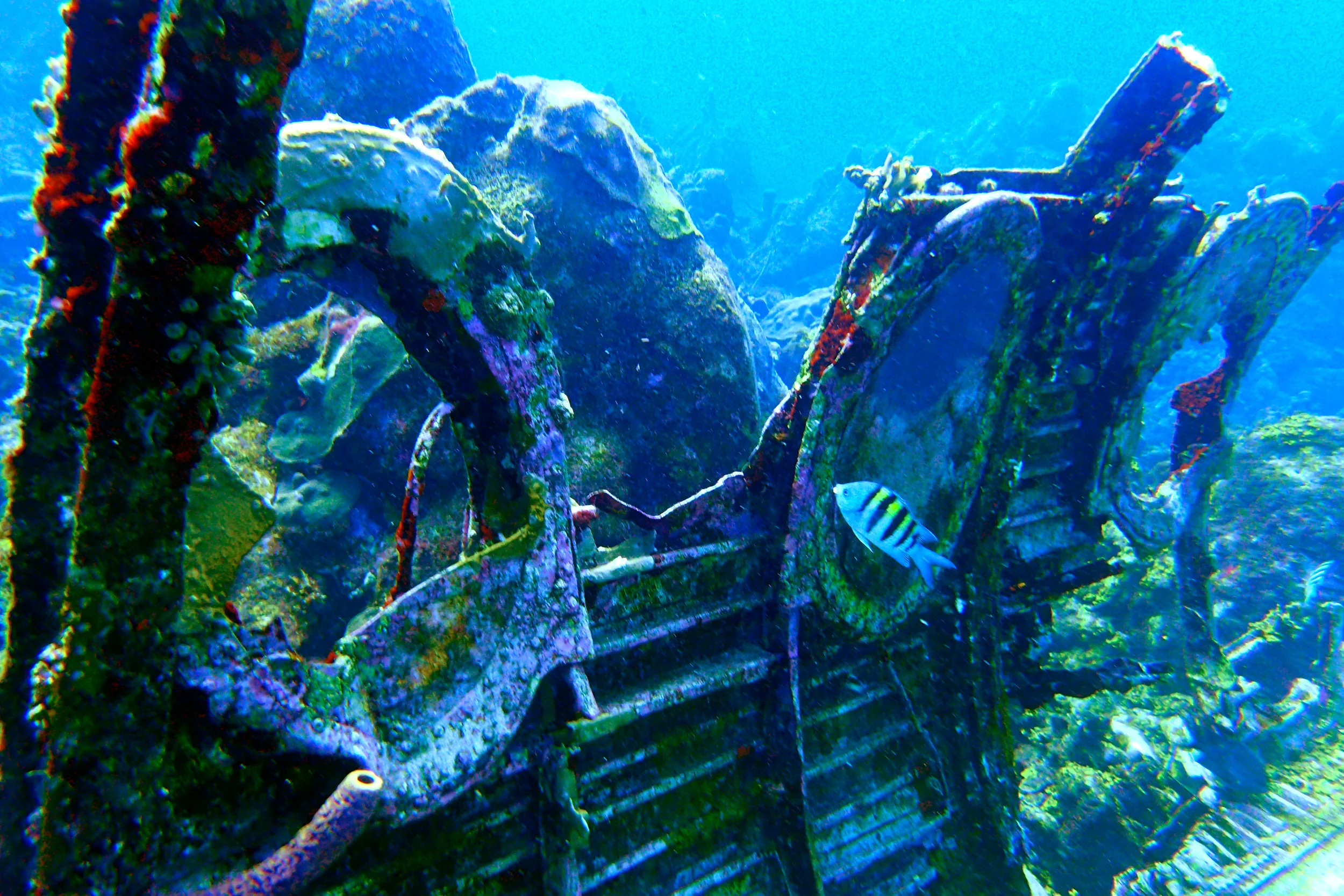 Originally sunk intact, 2008 Tropical Storm Omar tore it into pieces and scattered it across the sea floor. Hence, this is why the plane did not have any whole pieces for a swim-through. However, Elvin's plane wreck still has intact windows which were fun for photos!